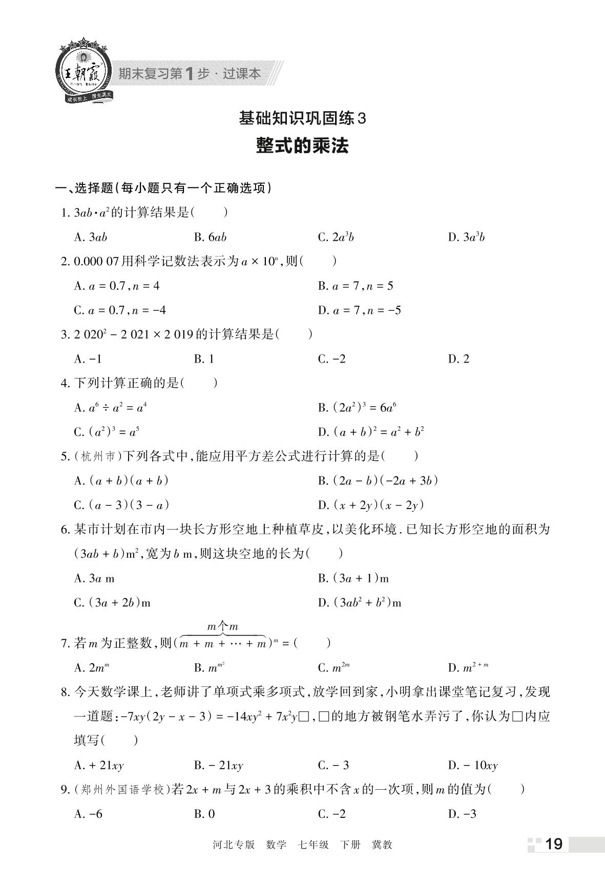 王朝霞期末过课本——基础知识巩固练3 整式的乘法七年级下册数学(冀教版)