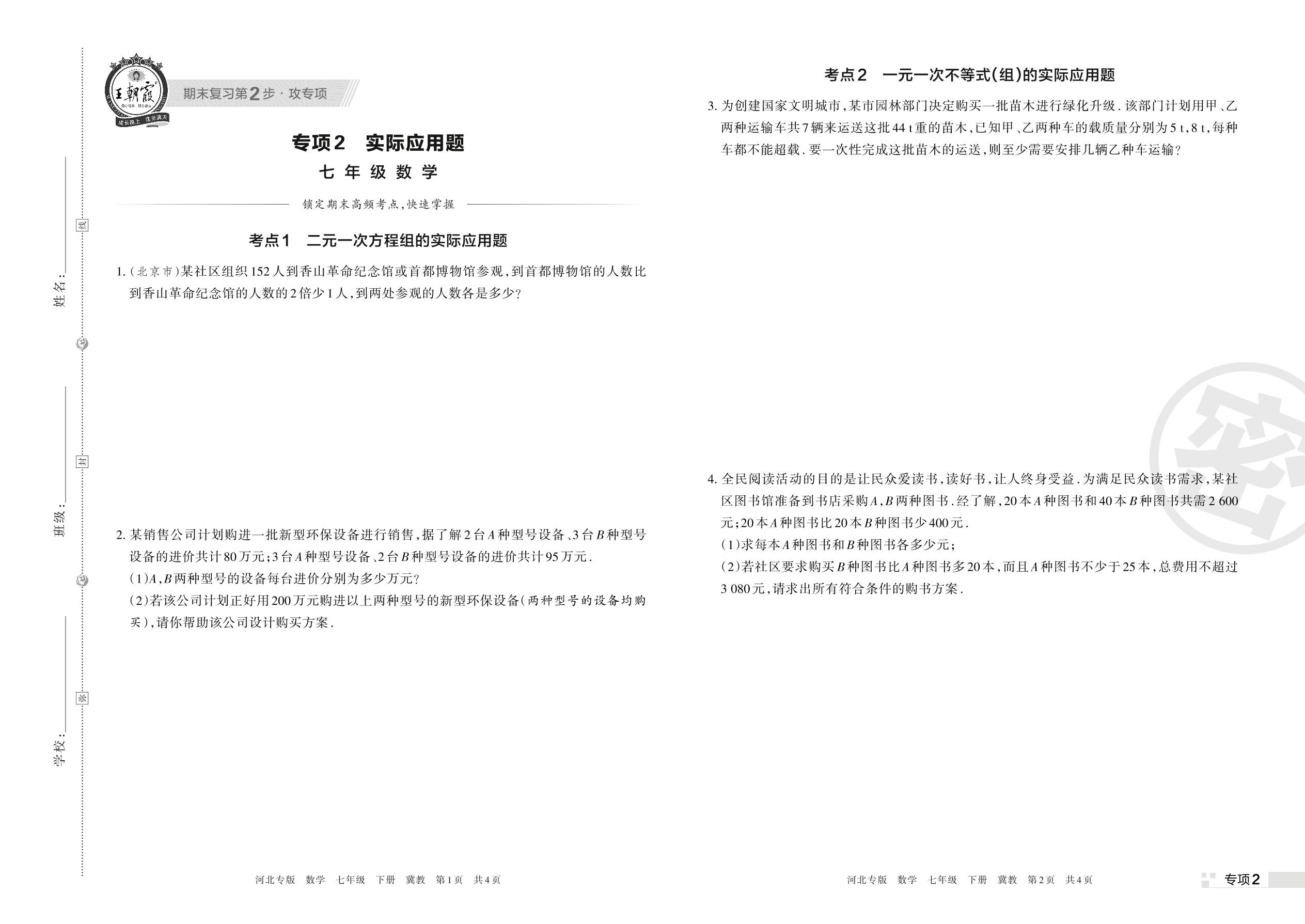 王朝霞期末专项卷——实际应用题七年级下册数学(冀教版)【2】