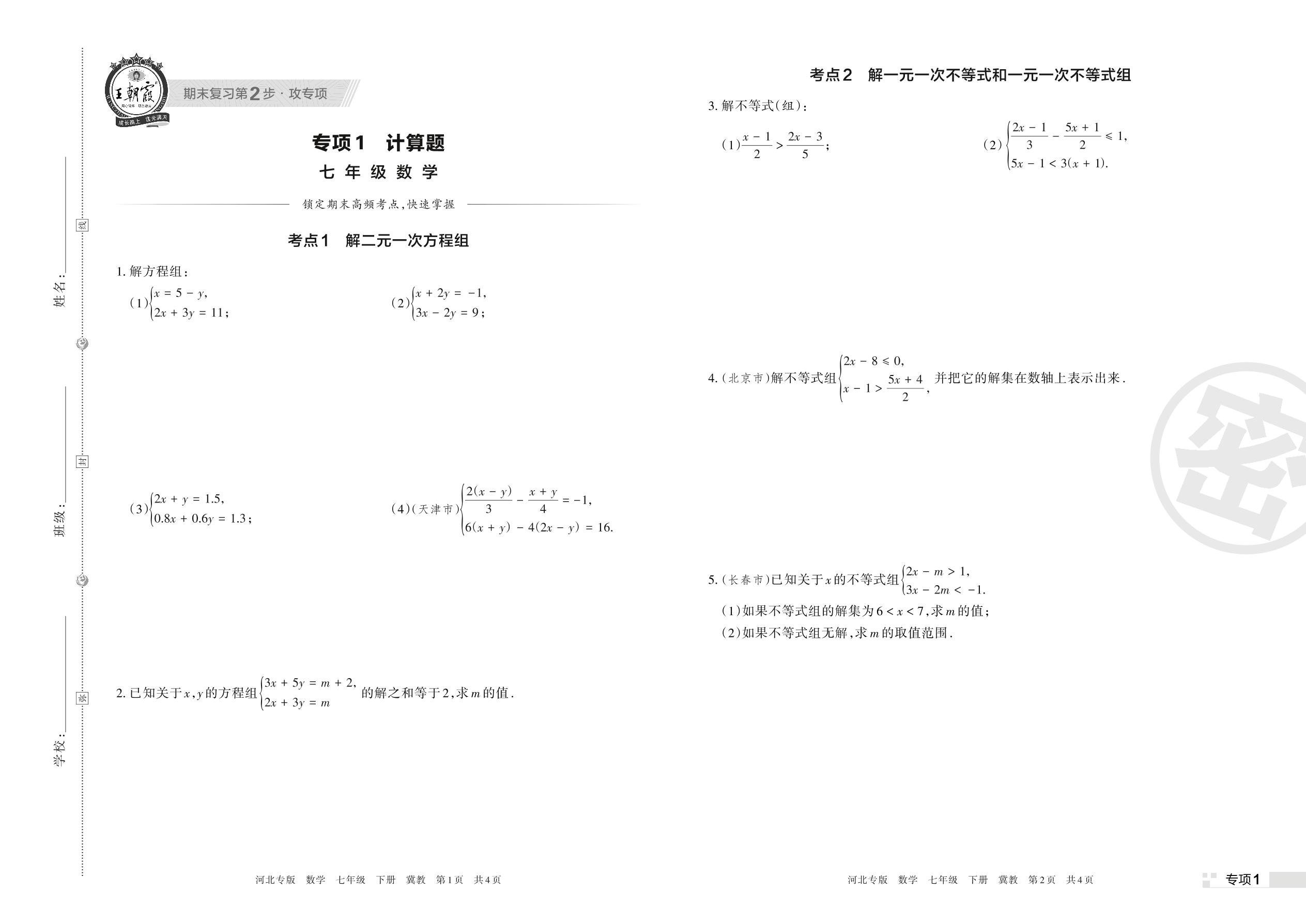 王朝霞期末专项卷——计算题七年级下册数学(冀教版)【1】
