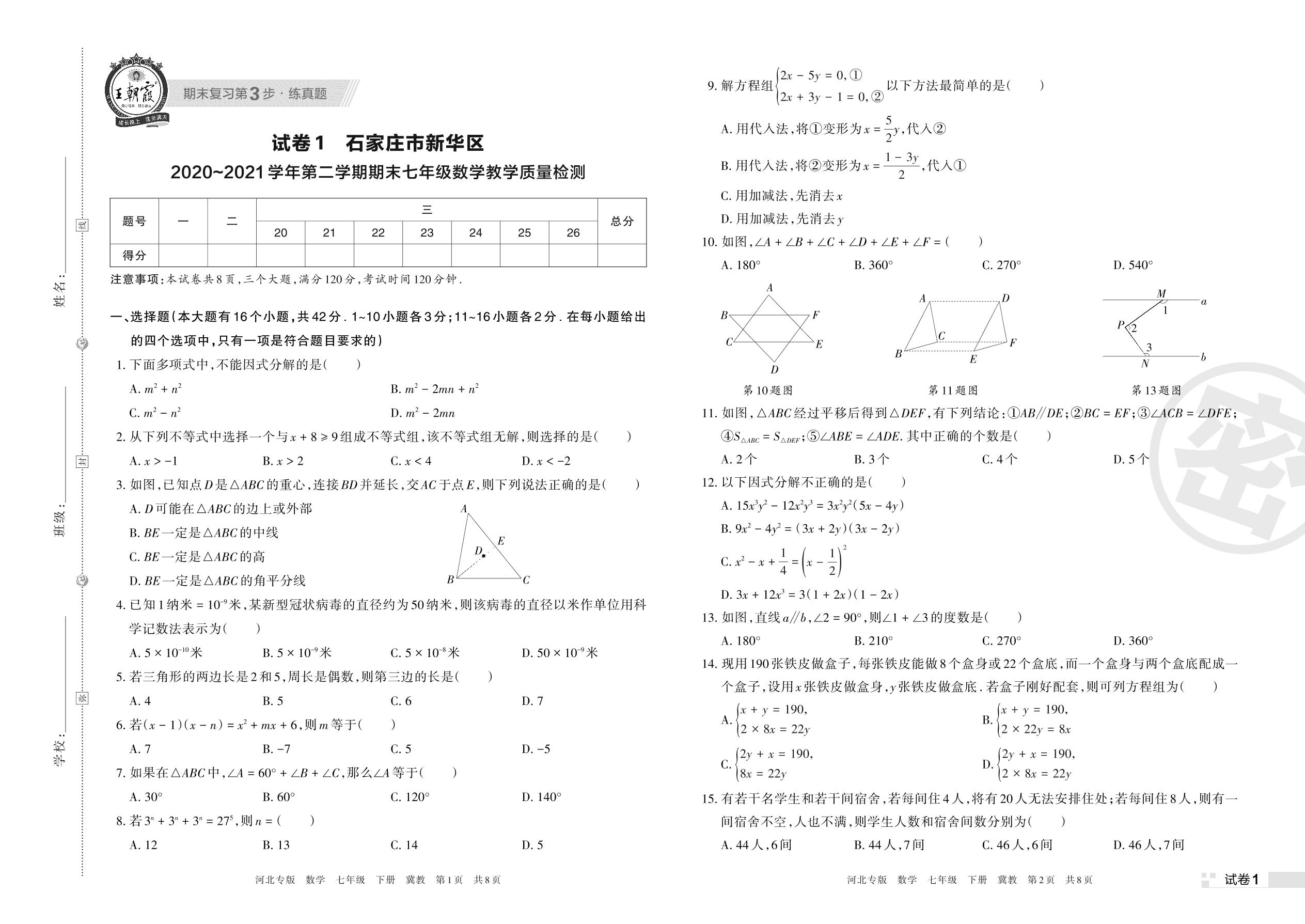 石家庄市新华区2020~2021学年第二学期期末七年级数学教学质量检测(冀教版)【1】