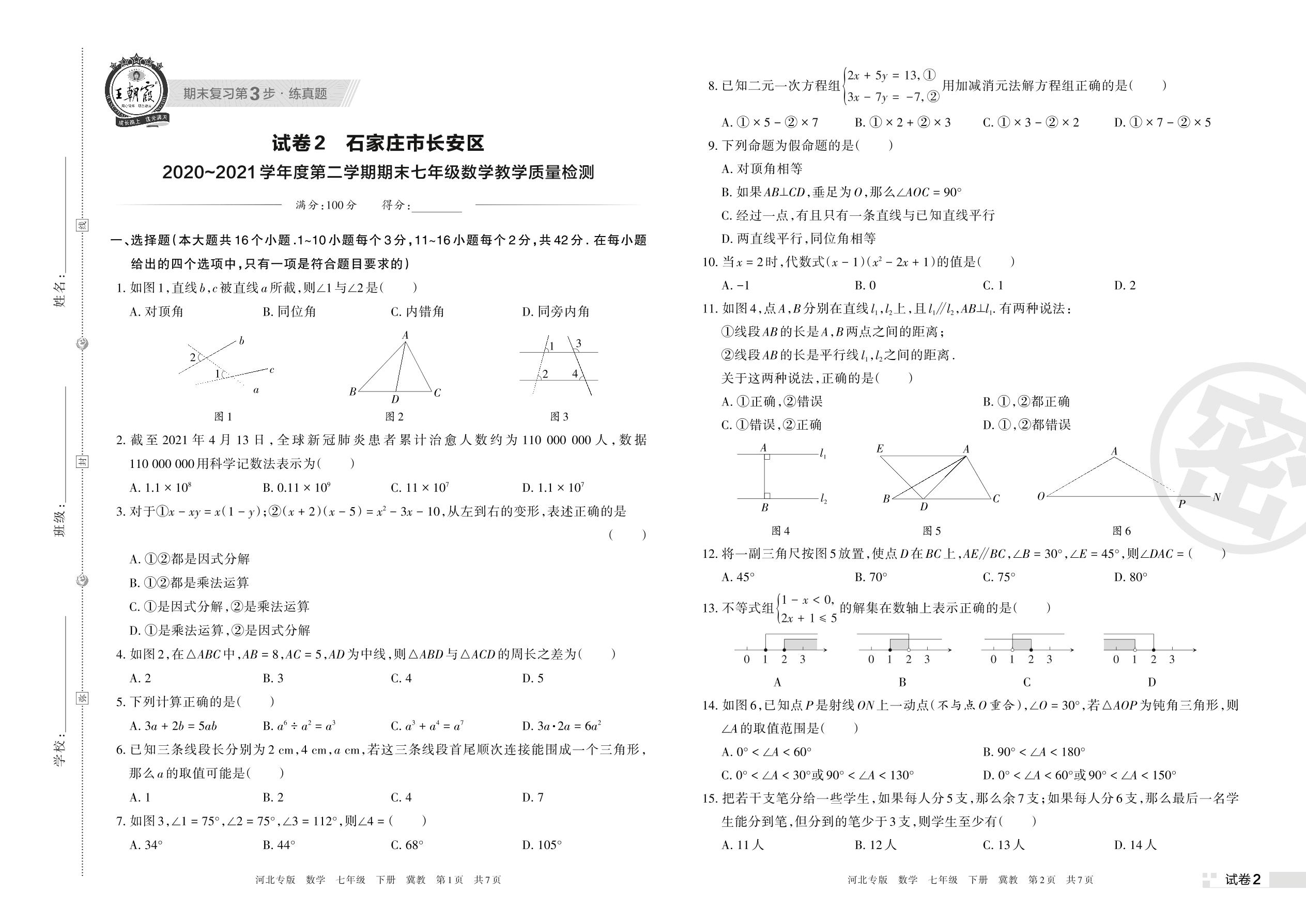 石家庄市长安区2020~2021学年度第二学期期末七年级数学教学质量检测(冀教版)【2】
