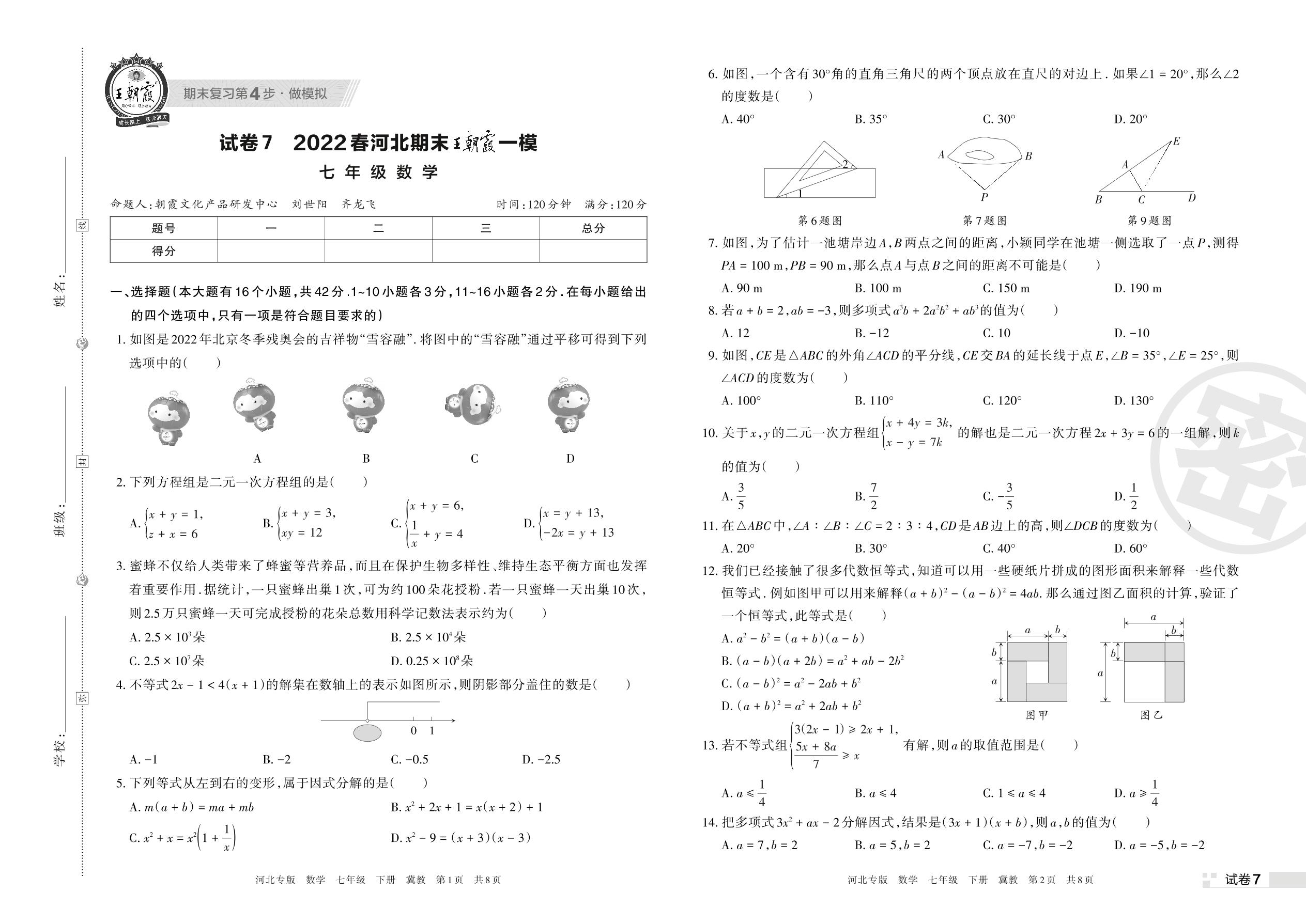 王朝霞期末模拟卷七年级下册数学(冀教版)【7】