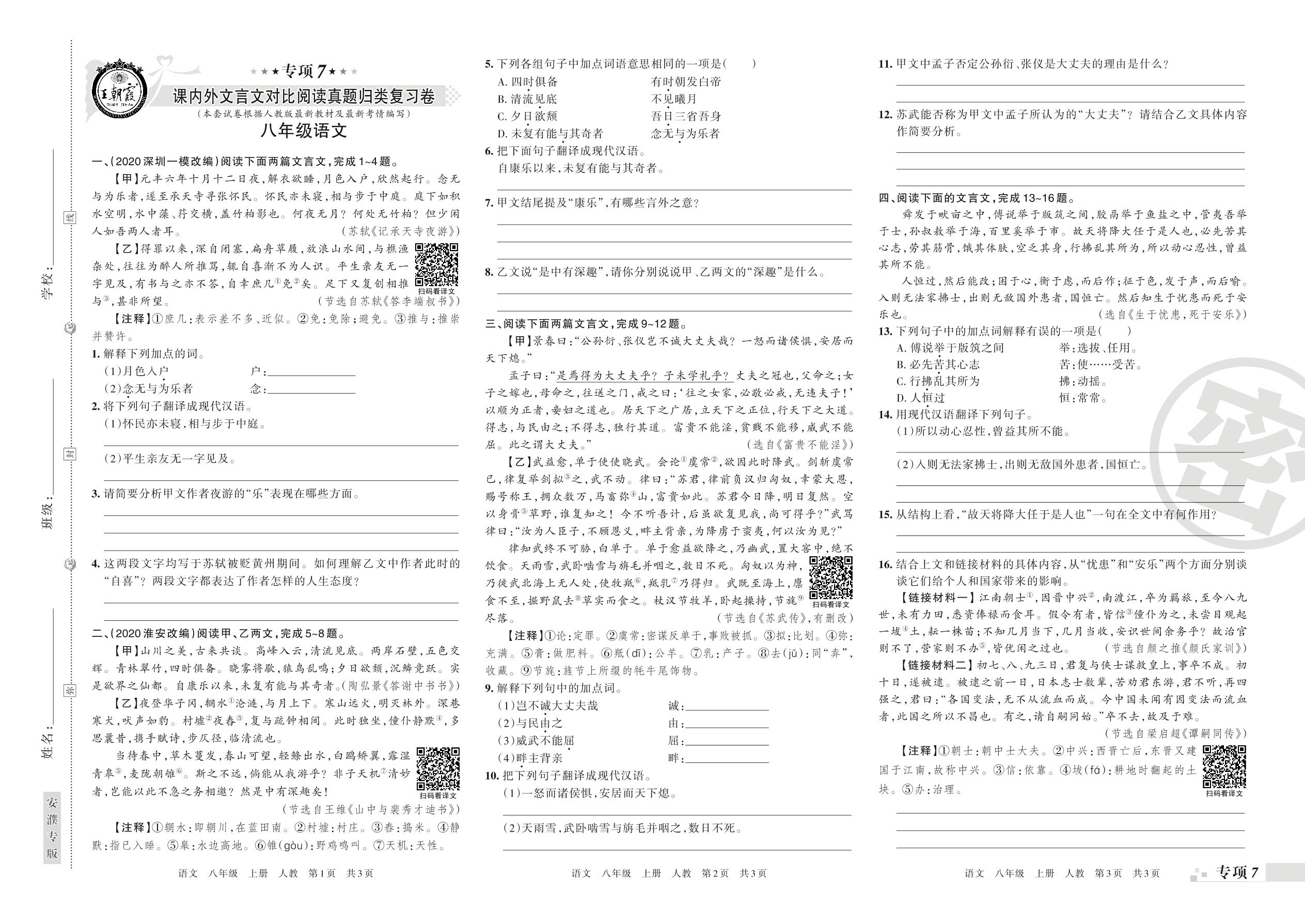 王朝霞期末专项卷——课内外文言文对比阅读、古诗词阅读真题归类复习八年级上册语文(人教版)_R21080211336【0】