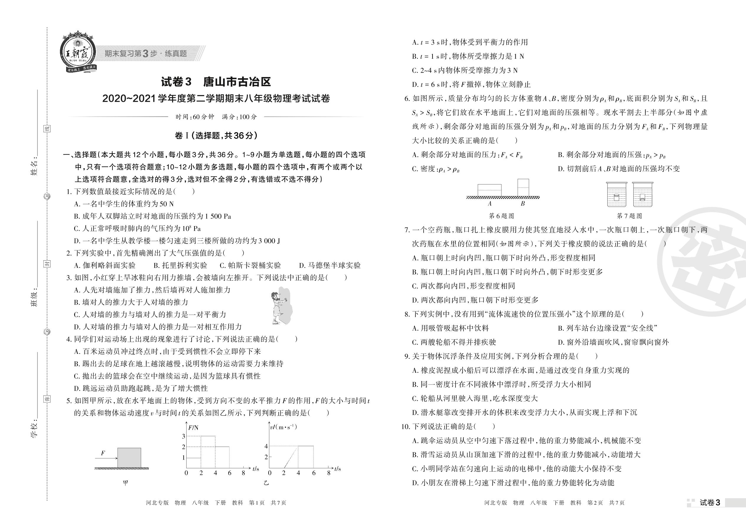 唐山市古冶区2020~2021学年度第二学期期末八年级物理考试试卷(教科版)【3】
