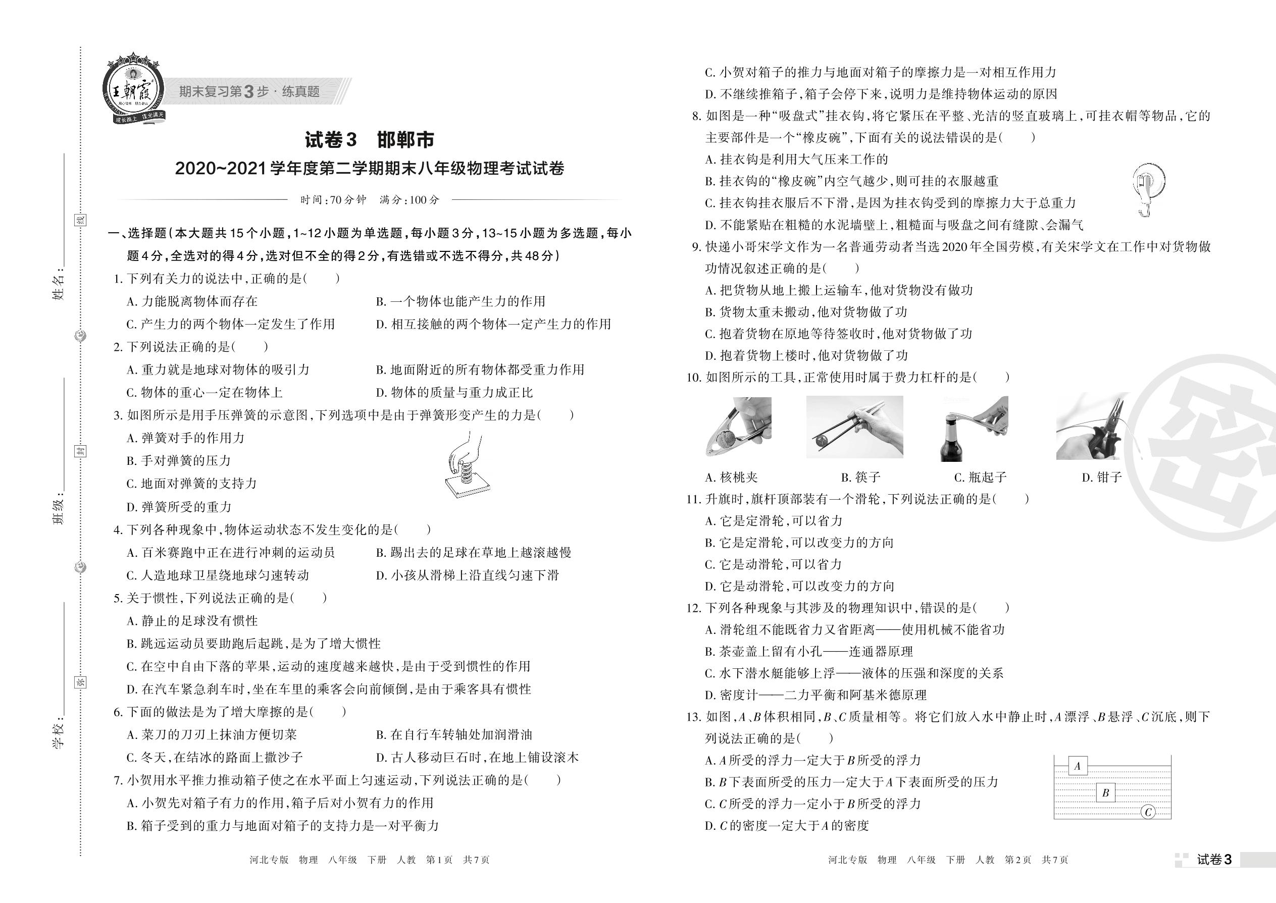 邯郸市2020~2021学年度第二学期期末八年级物理考试试卷(人教版)【3】