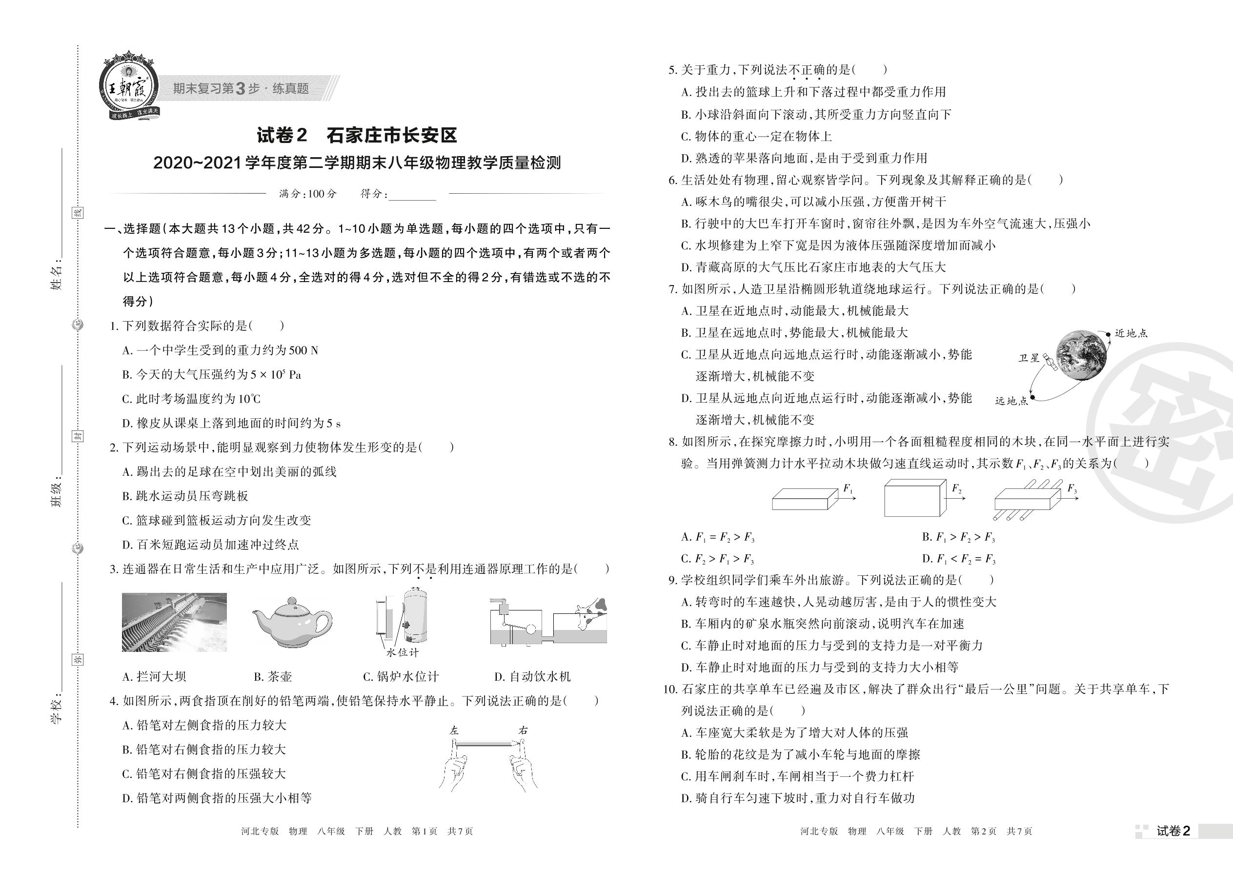 石家庄市长安区2020~2021学年度第二学期期末八年级物理教学质量检测(人教版)【2】