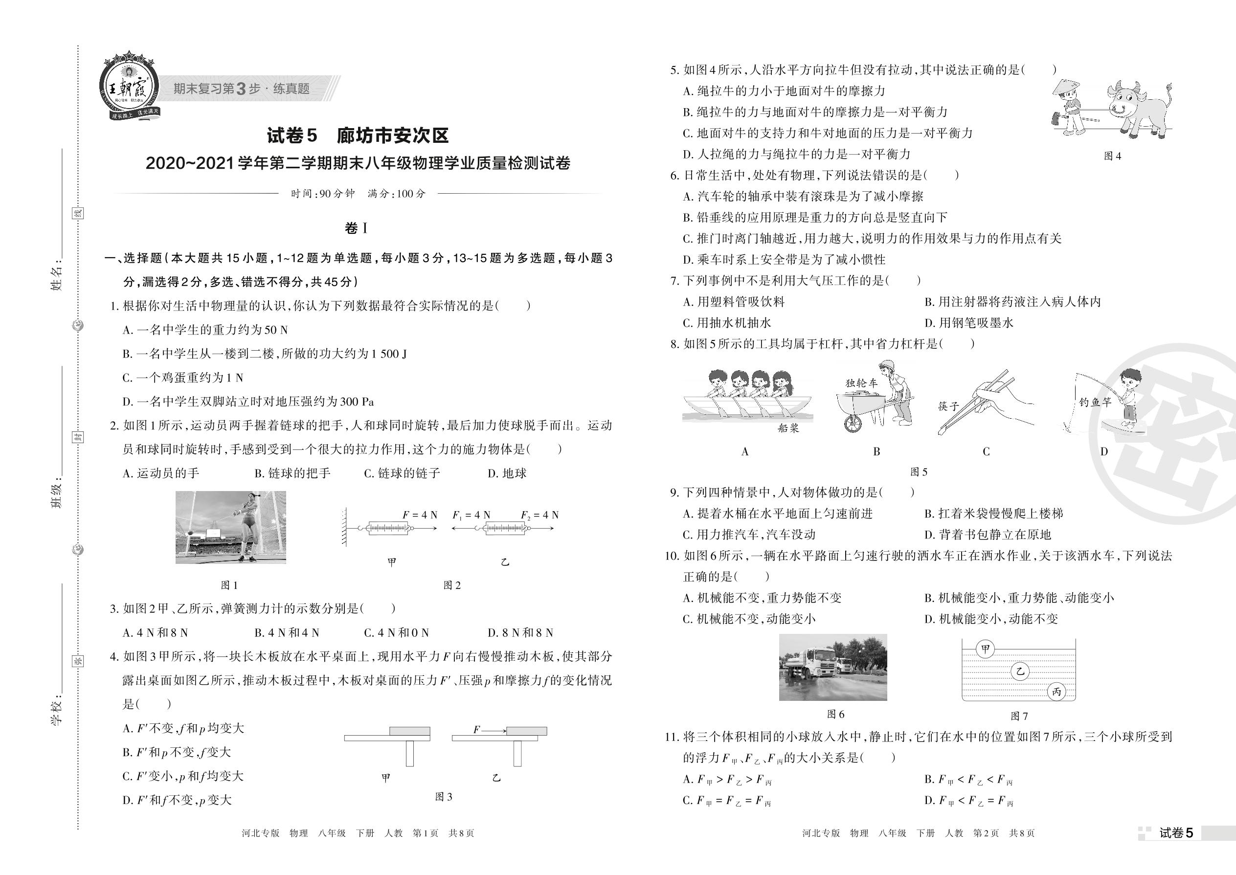廊坊市安次区2020~2021学年第二学期期末八年级物理学业质量检测试卷(人教版)【5】