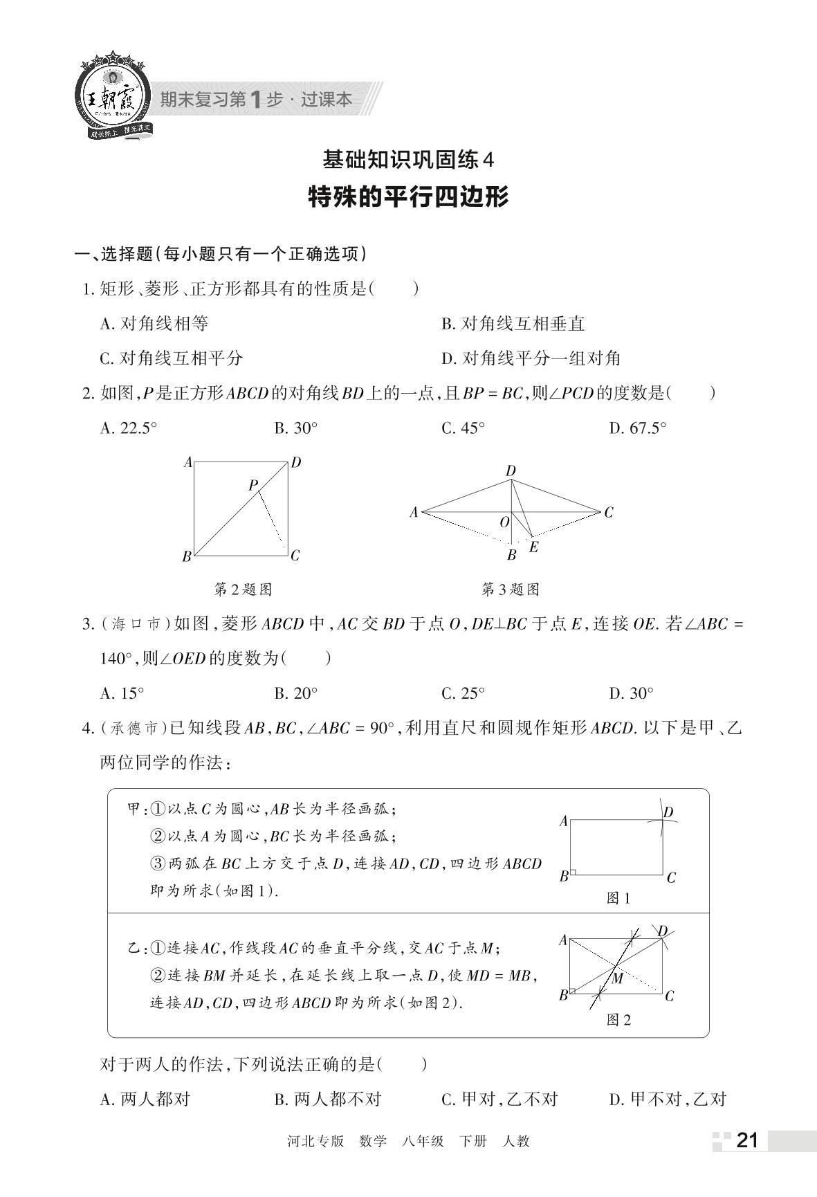 王朝霞期末过课本——基础知识巩固练4 特殊的平行四边形八年级下册数学(人教版)_R220321160021542