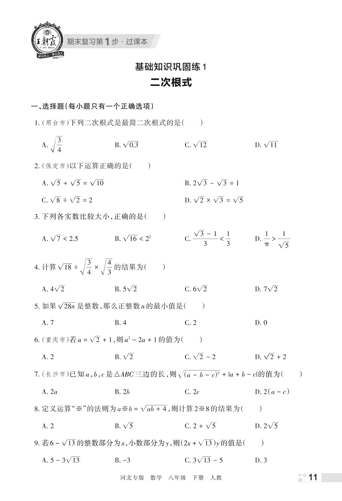 王朝霞期末过课本——基础知识巩固练1 二次根式八年级下册数学(人教版)_R220321160021114