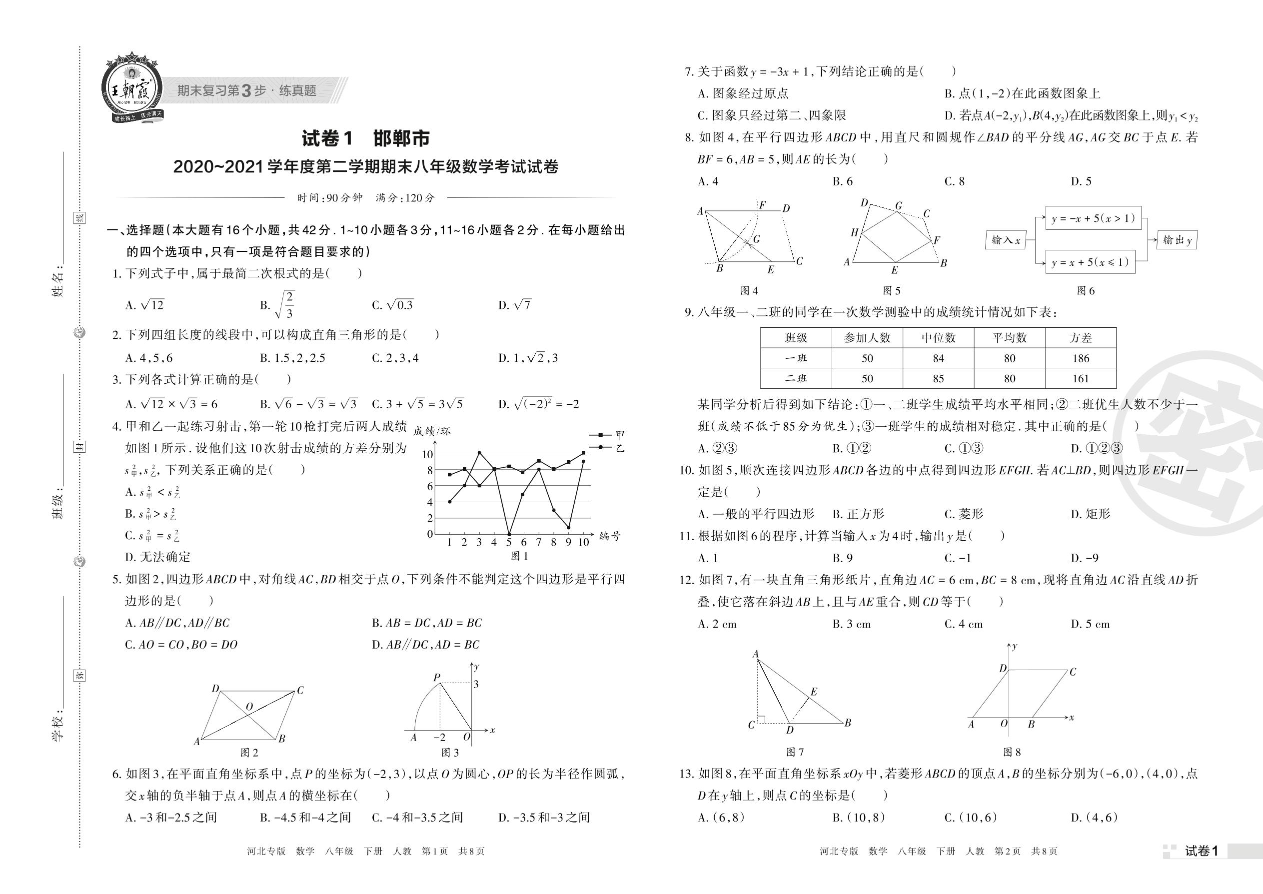 邯郸市2020~2021学年度第二学期期末八年级数学考试试卷(人教版)【1】