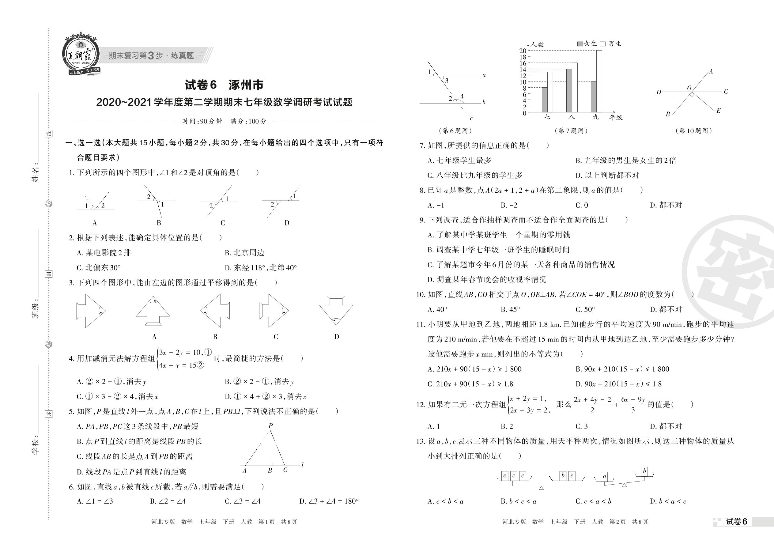 涿州市2020~2021学年度第二学期期末七年级数学调研考试试题(人教版)【6】