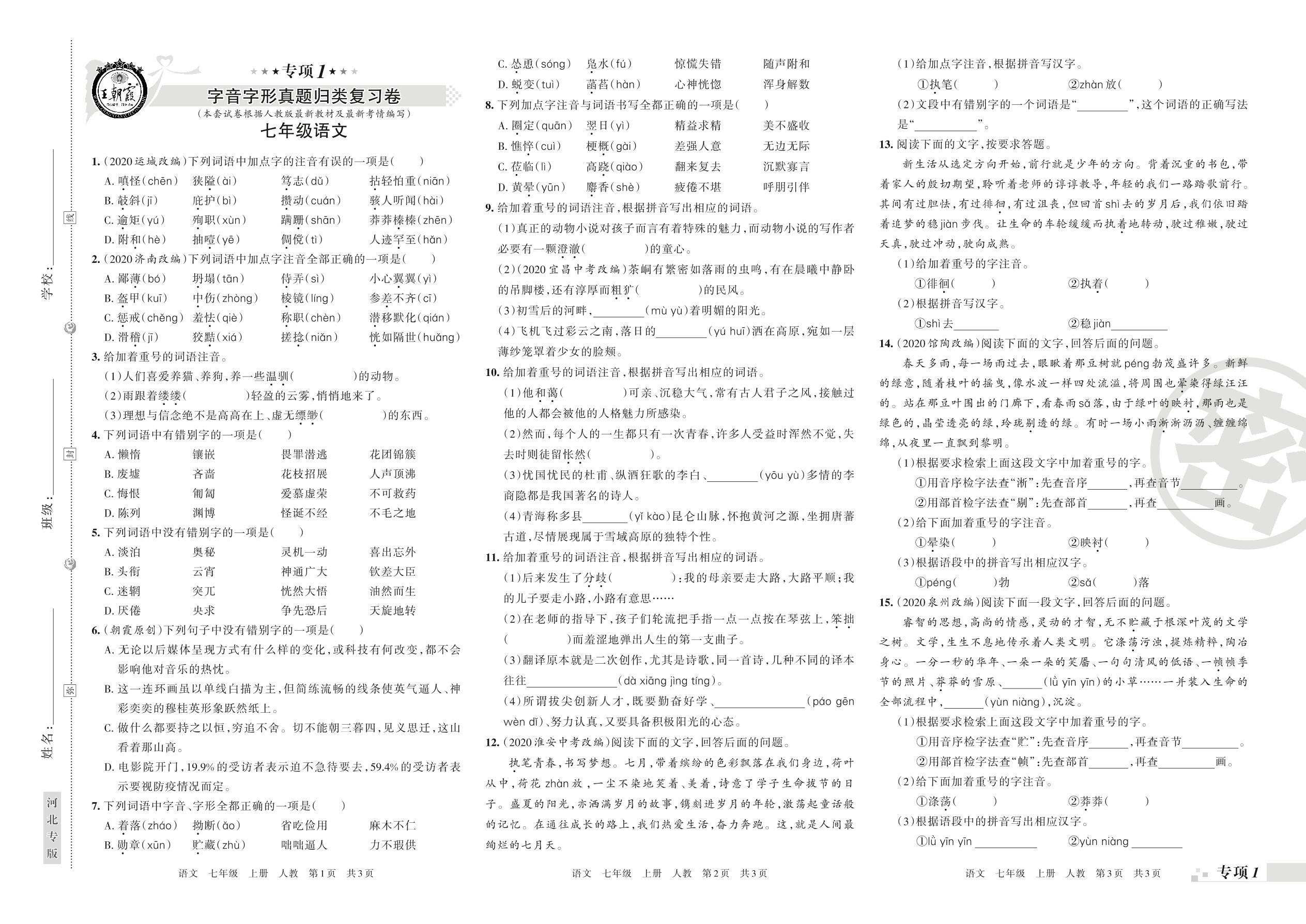 王朝霞期末专项卷——字音字形、词语理解与运用真题归类复习七年级上册语文(人教版)【0】