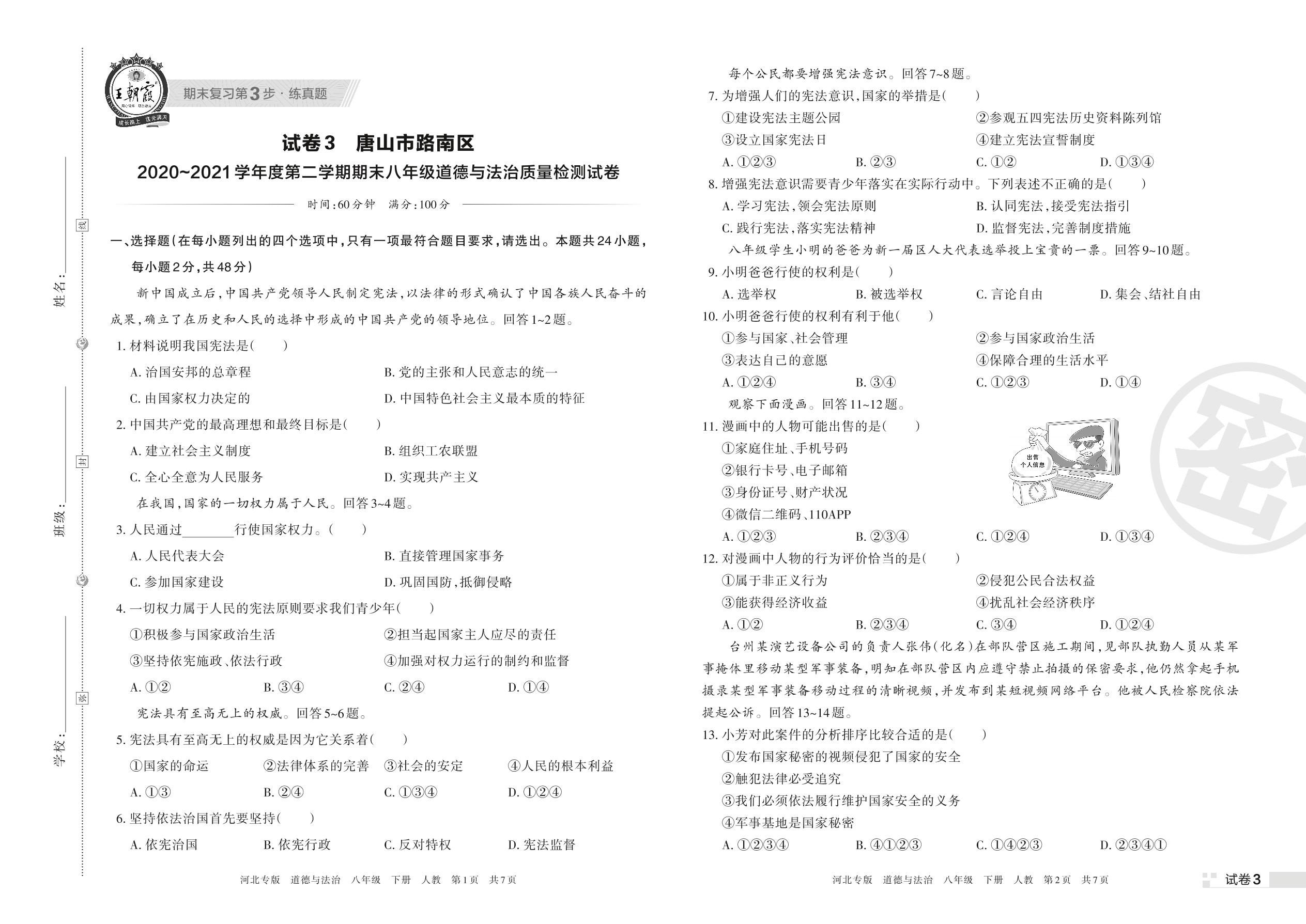 唐山市路南区2020~2021学年度第二学期期末八年级道德与法治质量检测试卷(人教版)【3】