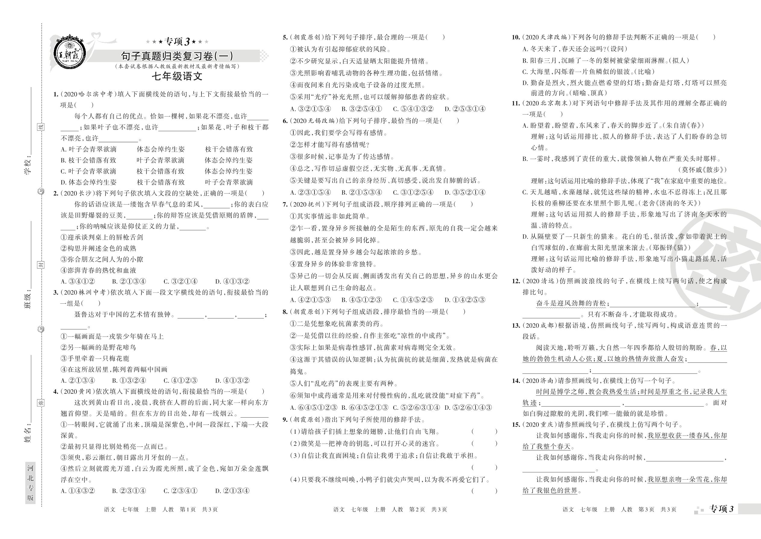 王朝霞期末专项卷——句子真题归类复习七年级上册语文(人教版)【0】