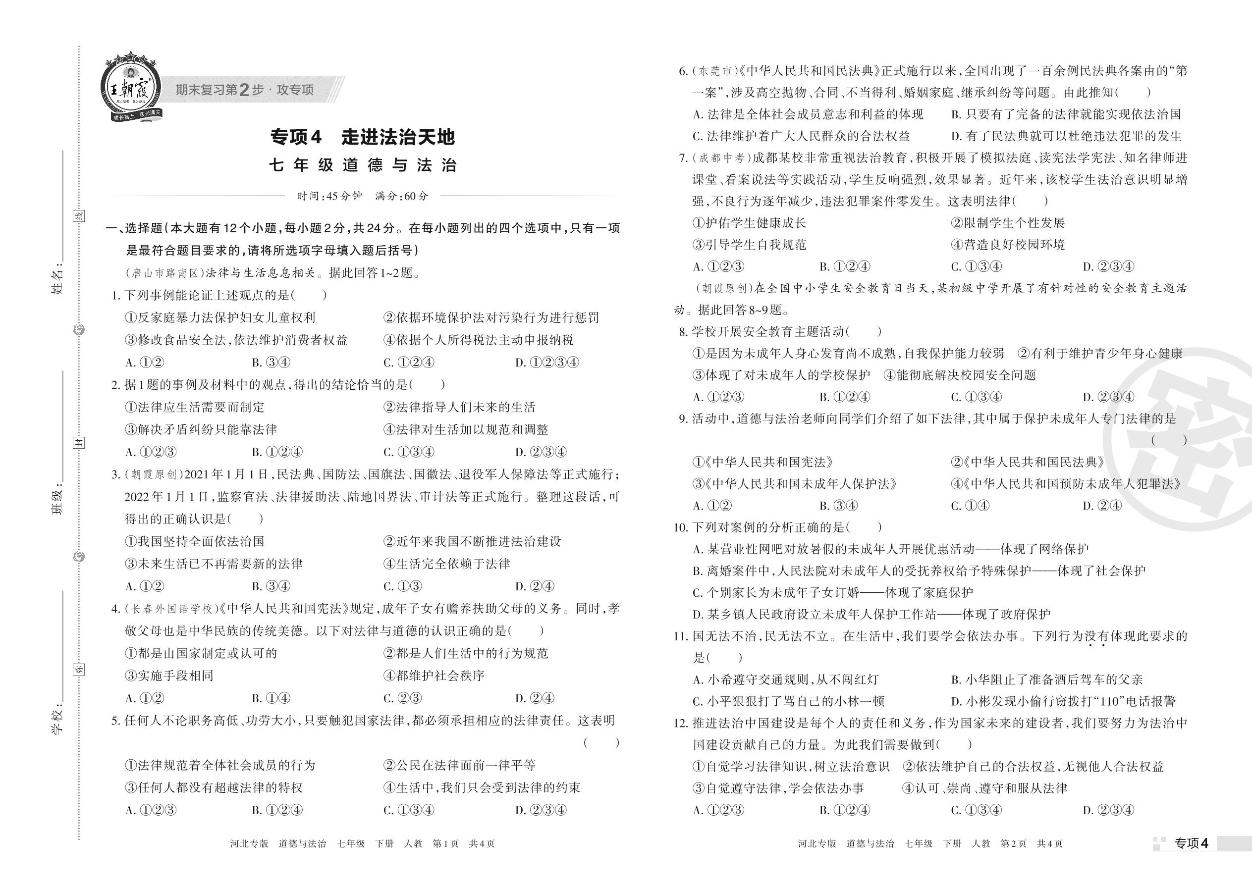 王朝霞期末专项卷——走进法治天地七年级下册道德与法治(人教版)【4】