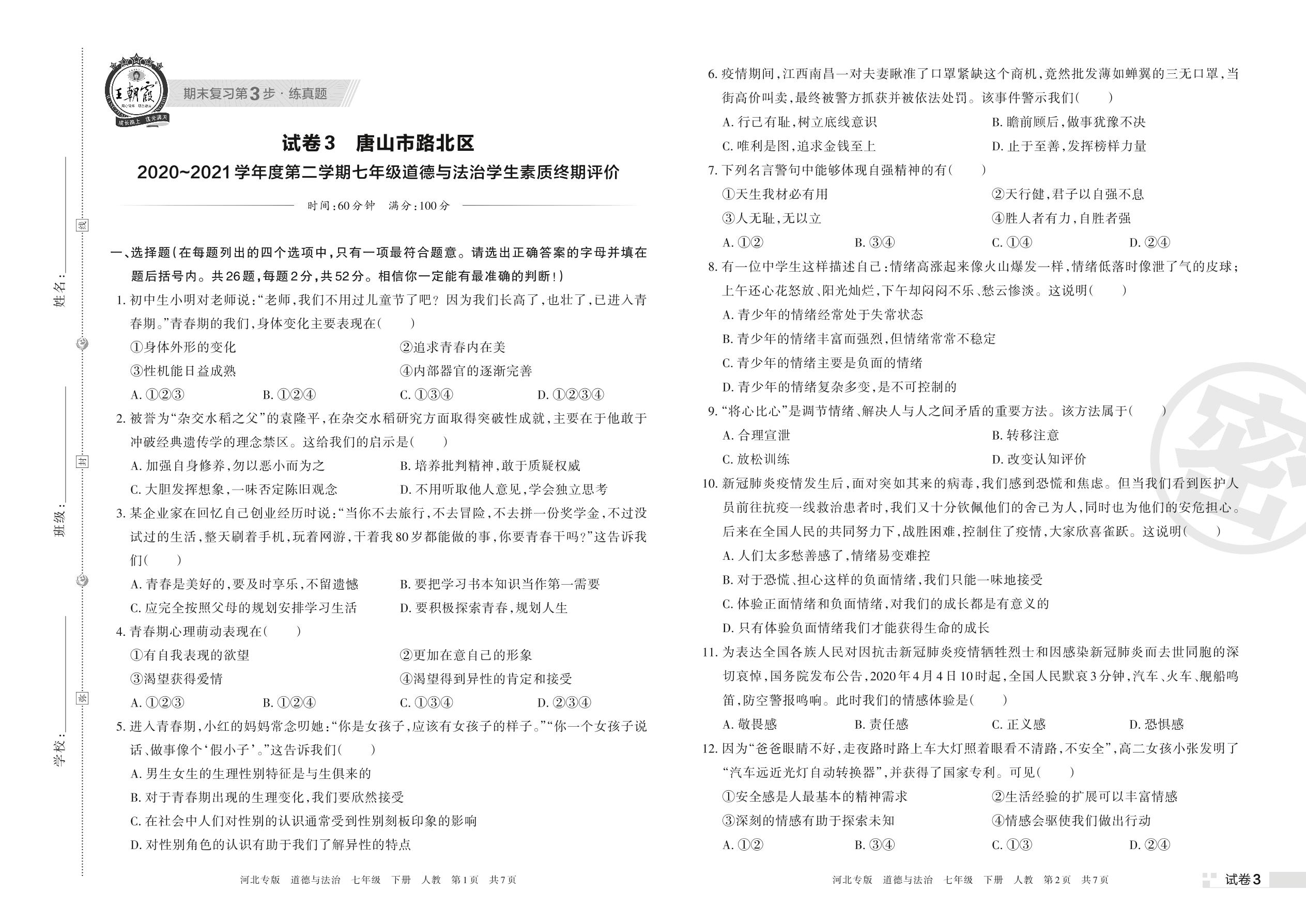 唐山市路北区2020~2021学年度第二学期七年级道德与法治学生素质终期评价(人教版)【3】