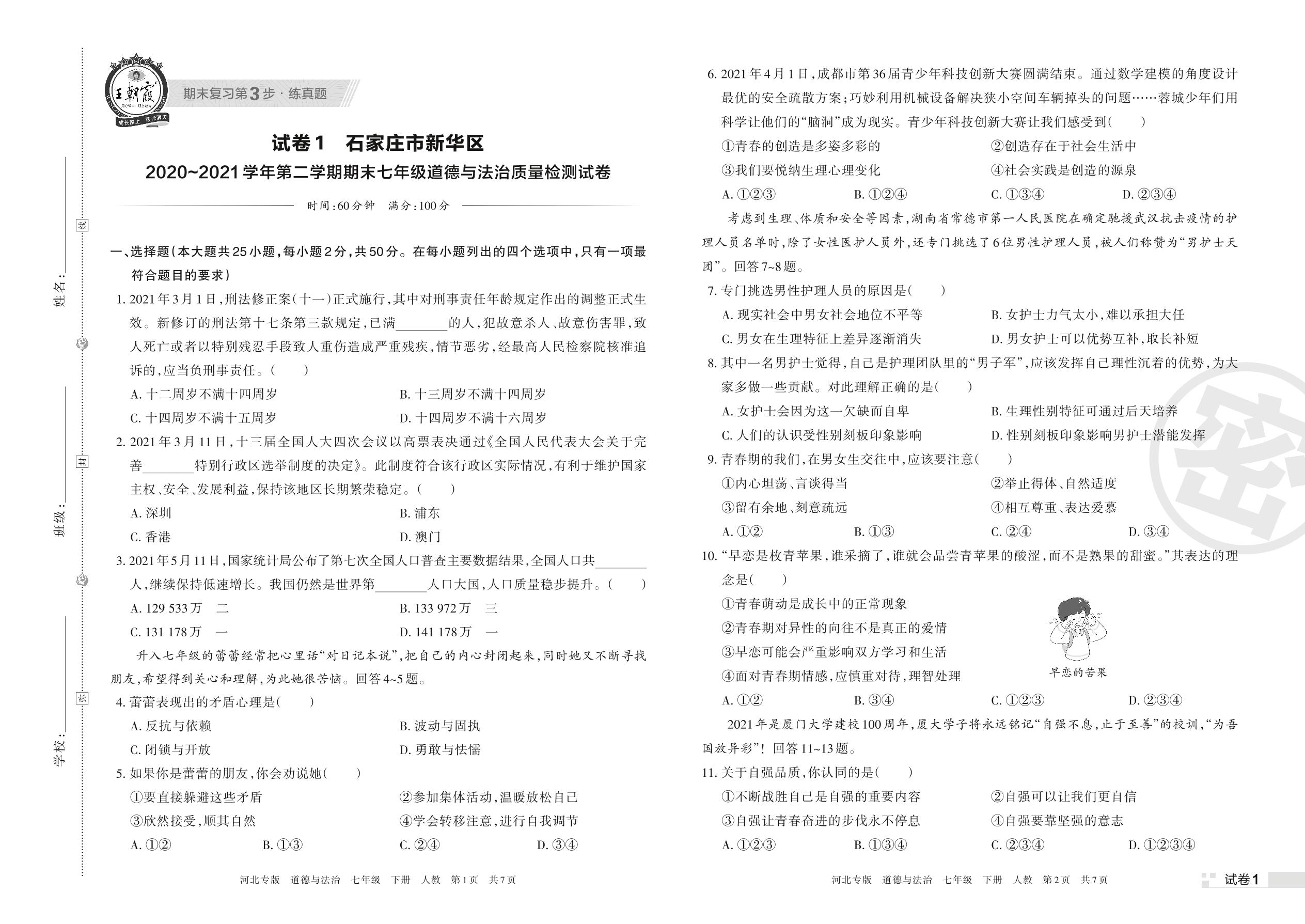 石家庄市新华区2020~2021学年第二学期期末七年级道德与法治质量检测试卷(人教版)【1】