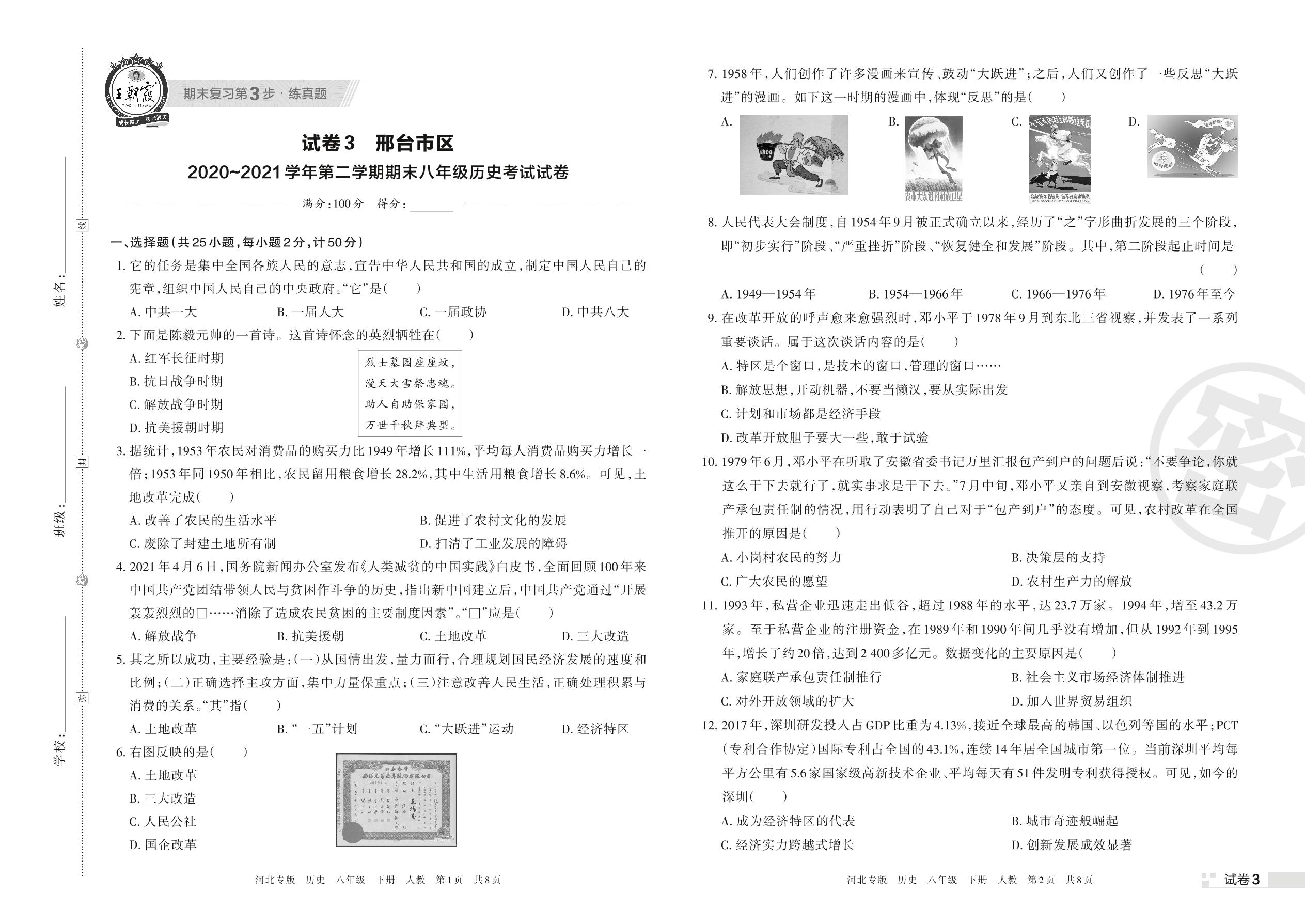 邢台市区2020~2021学年第二学期期末八年级历史考试试卷(人教版)【3】