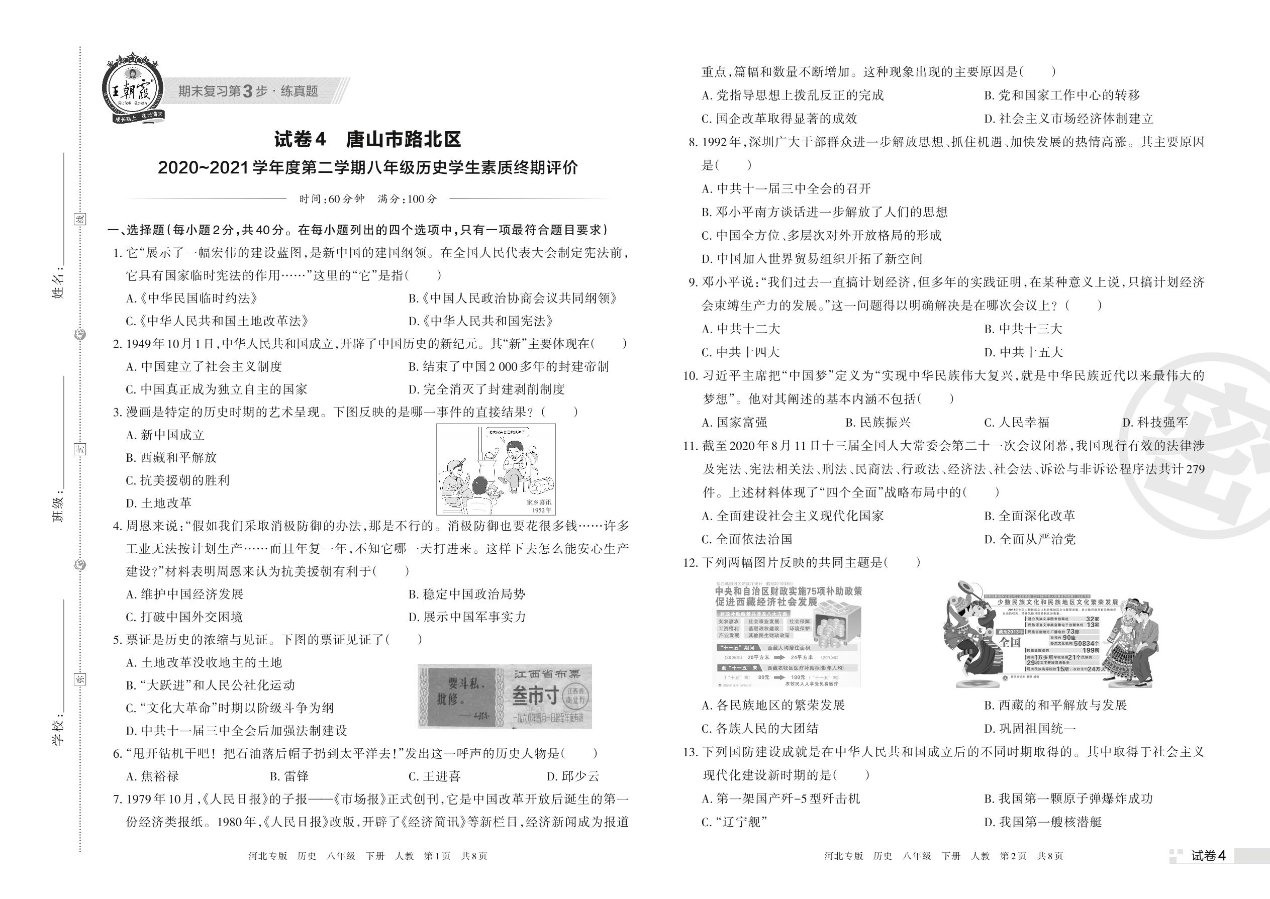 唐山市路北区2020~2021学年度第二学期八年级历史学生素质终期评价(人教版)【4】