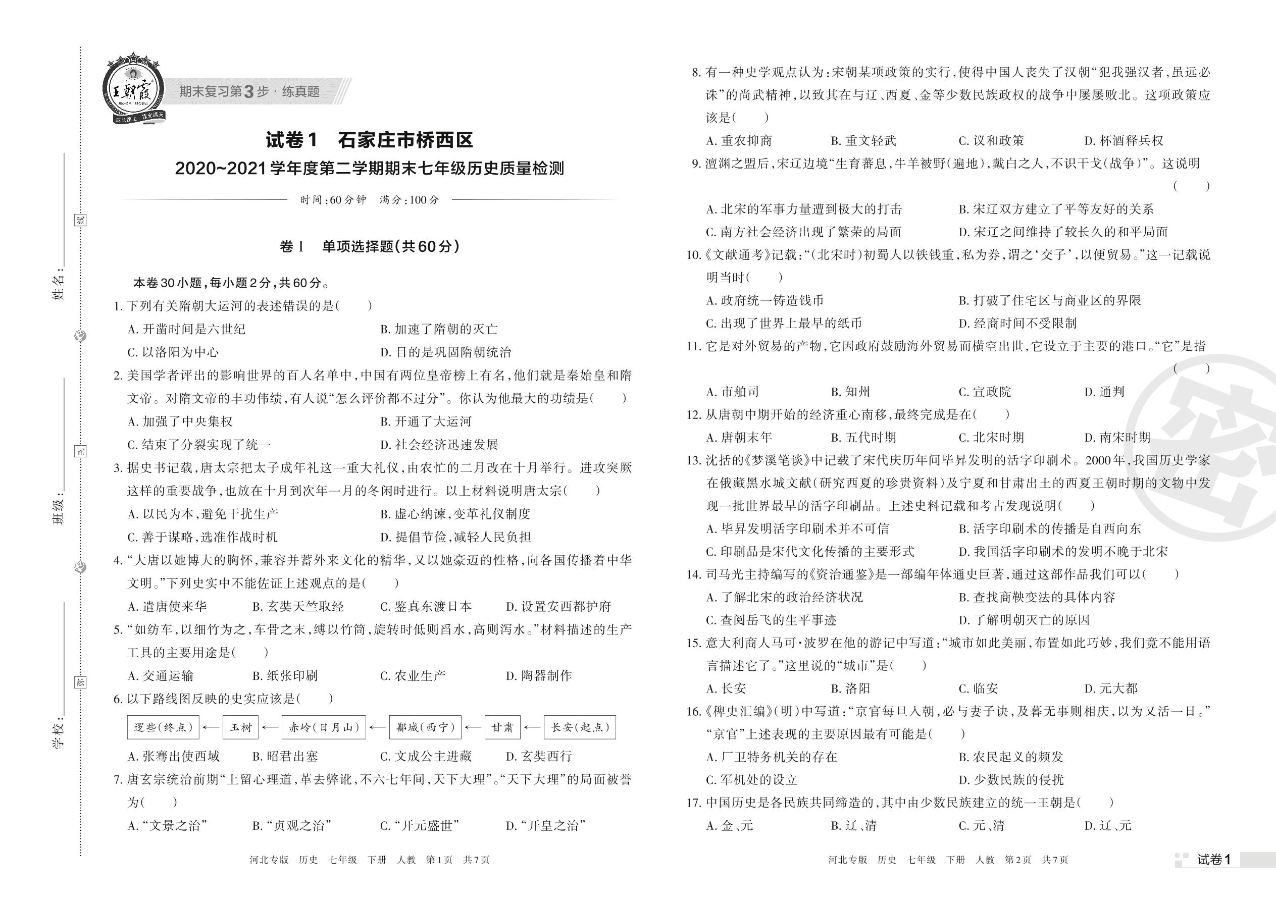 石家庄市桥西区2020~2021学年度第二学期期末七年级历史质量检测(人教版)【1】