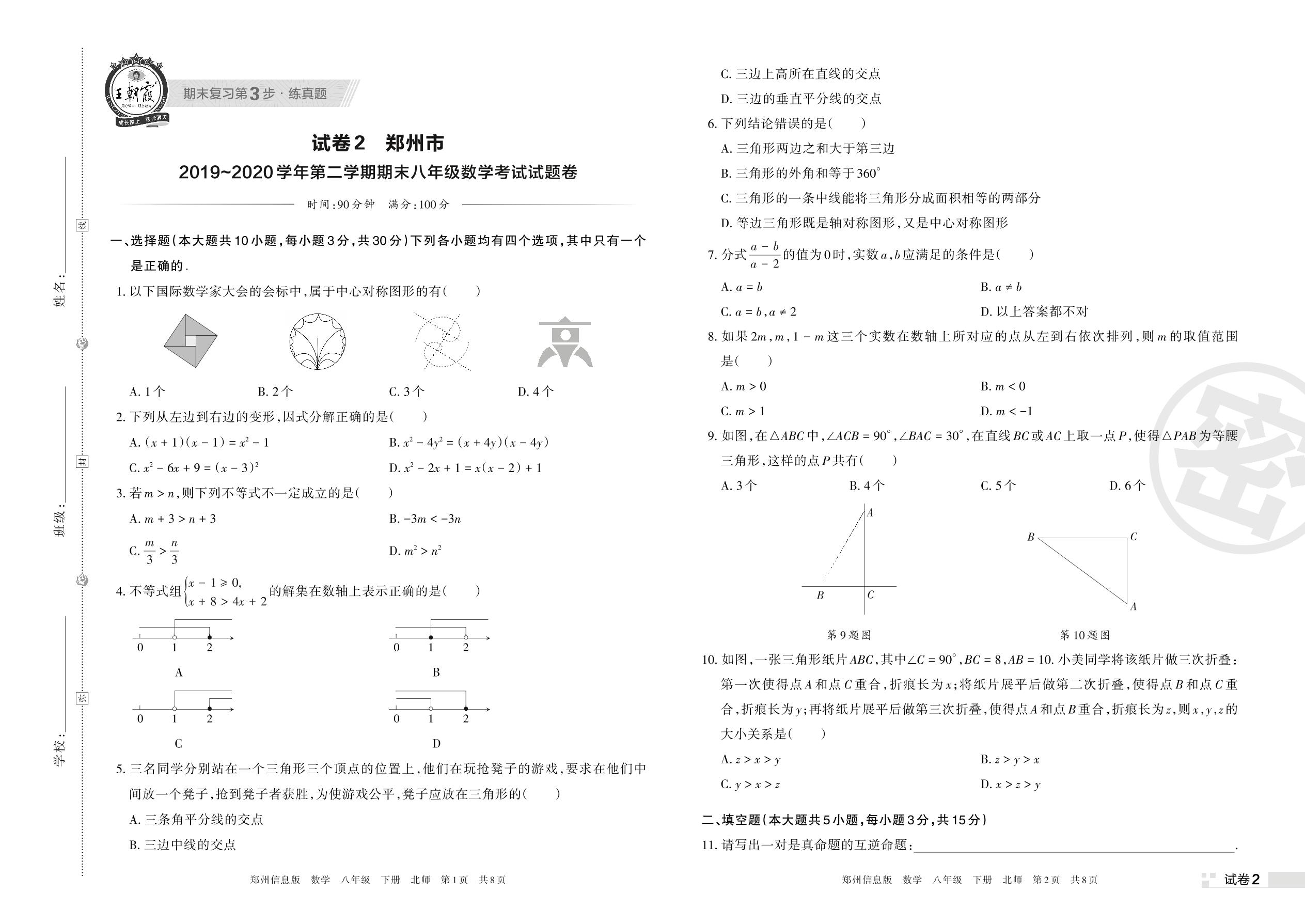郑州市2019~2020学年第二学期期末八年级数学考试试题卷(北师版)【2】