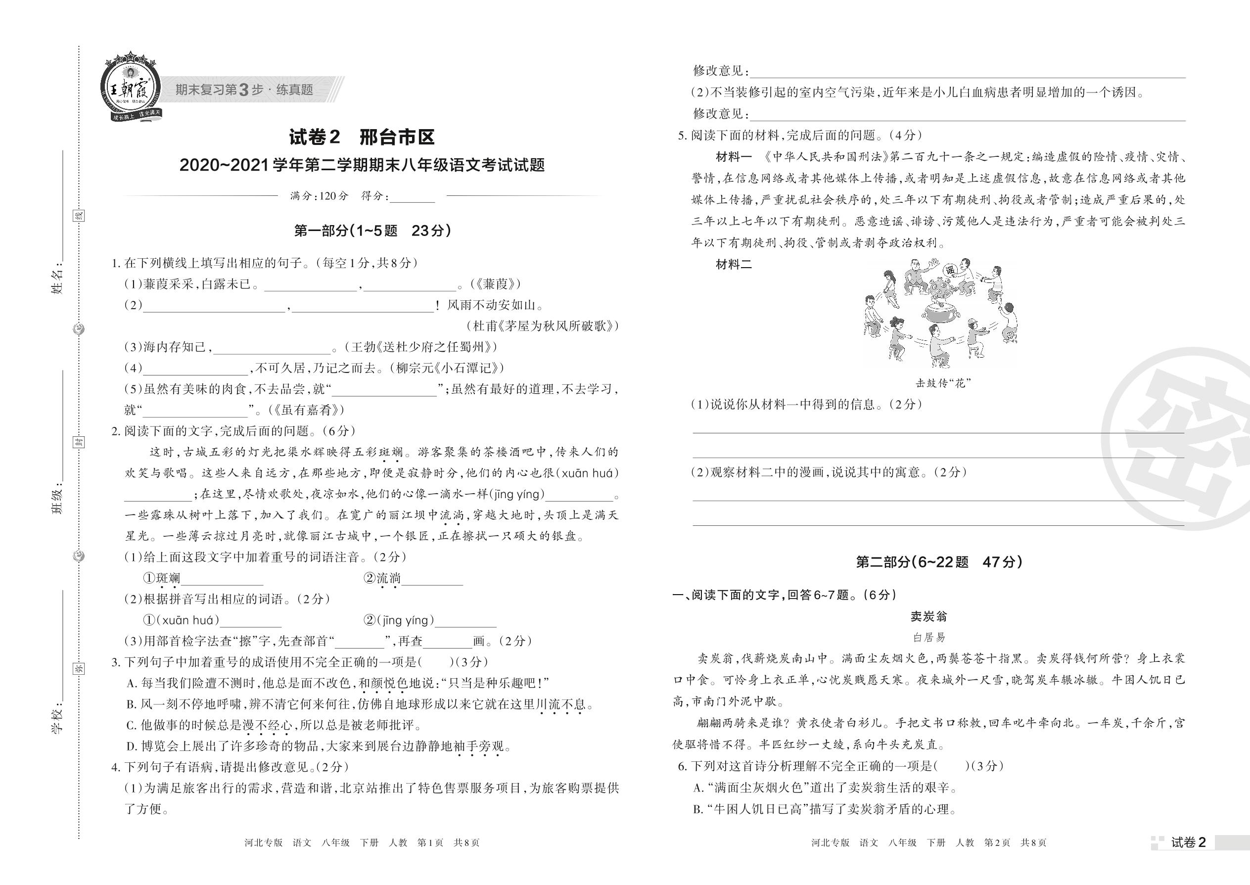 邢台市区2020~2021学年第二学期期末八年级语文考试试题(人教版)【2】