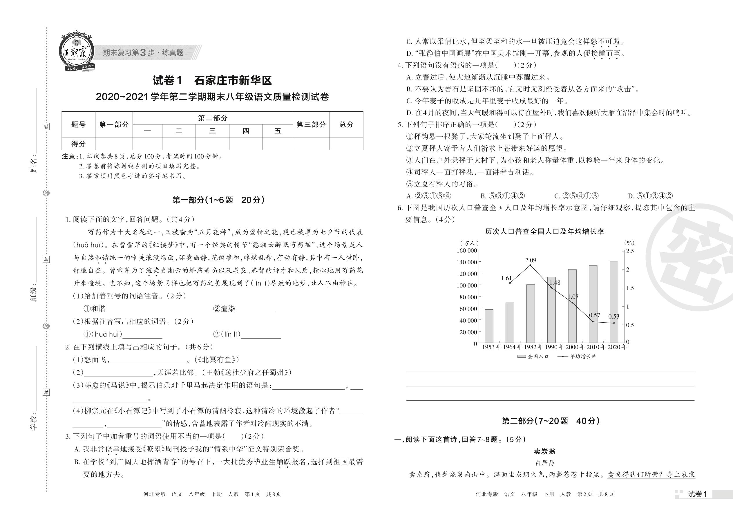 石家庄市新华区2020~2021学年第二学期期末八年级语文质量检测试卷(人教版)【1】