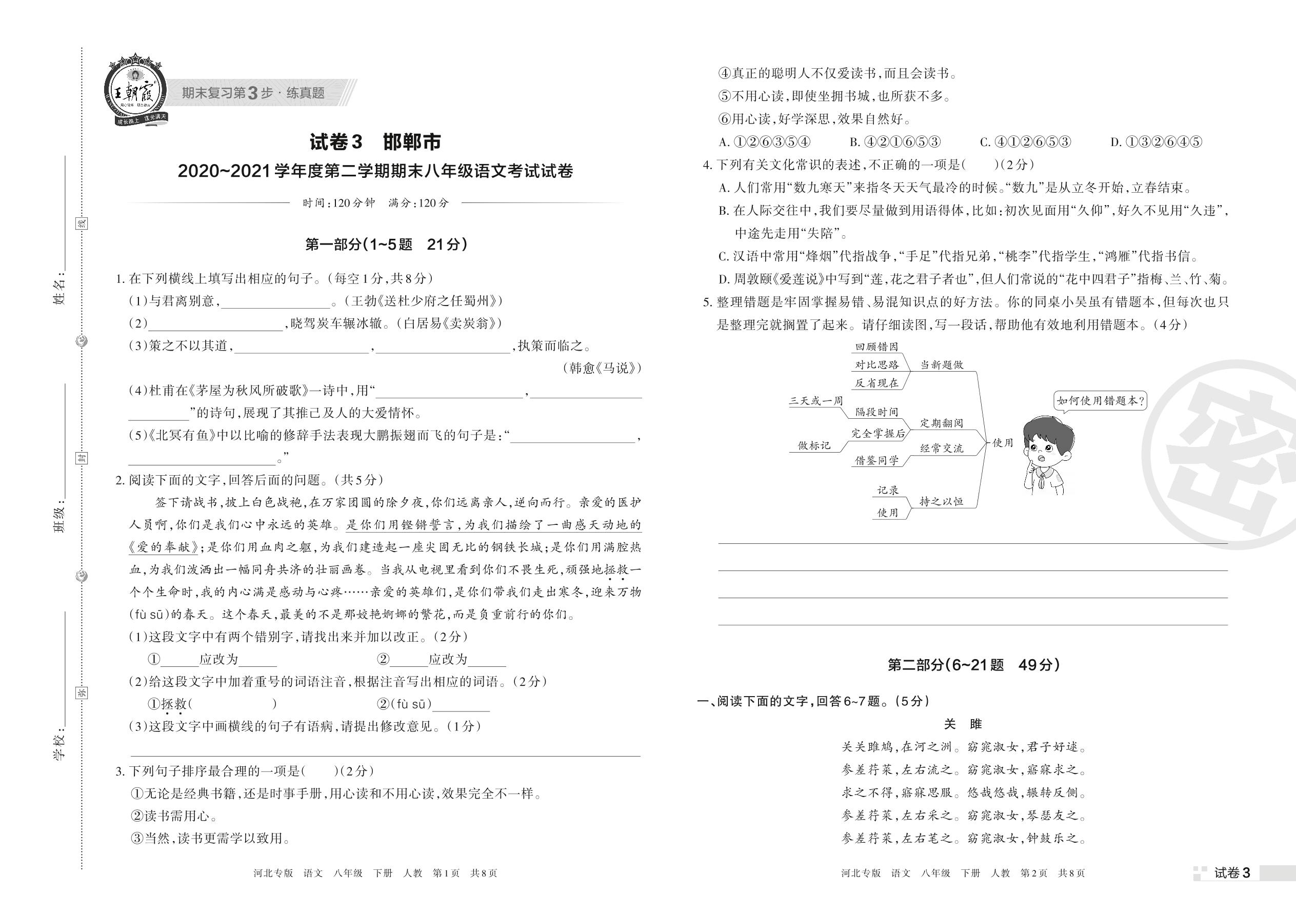 邯郸市2020~2021学年度第二学期期末八年级语文考试试卷(人教版)【3】