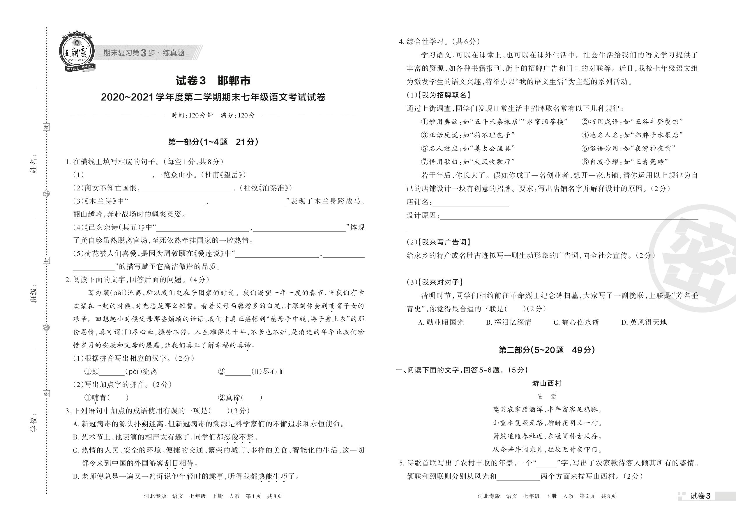 邯郸市2020~2021学年度第二学期期末七年级语文考试试卷(人教版)【3】