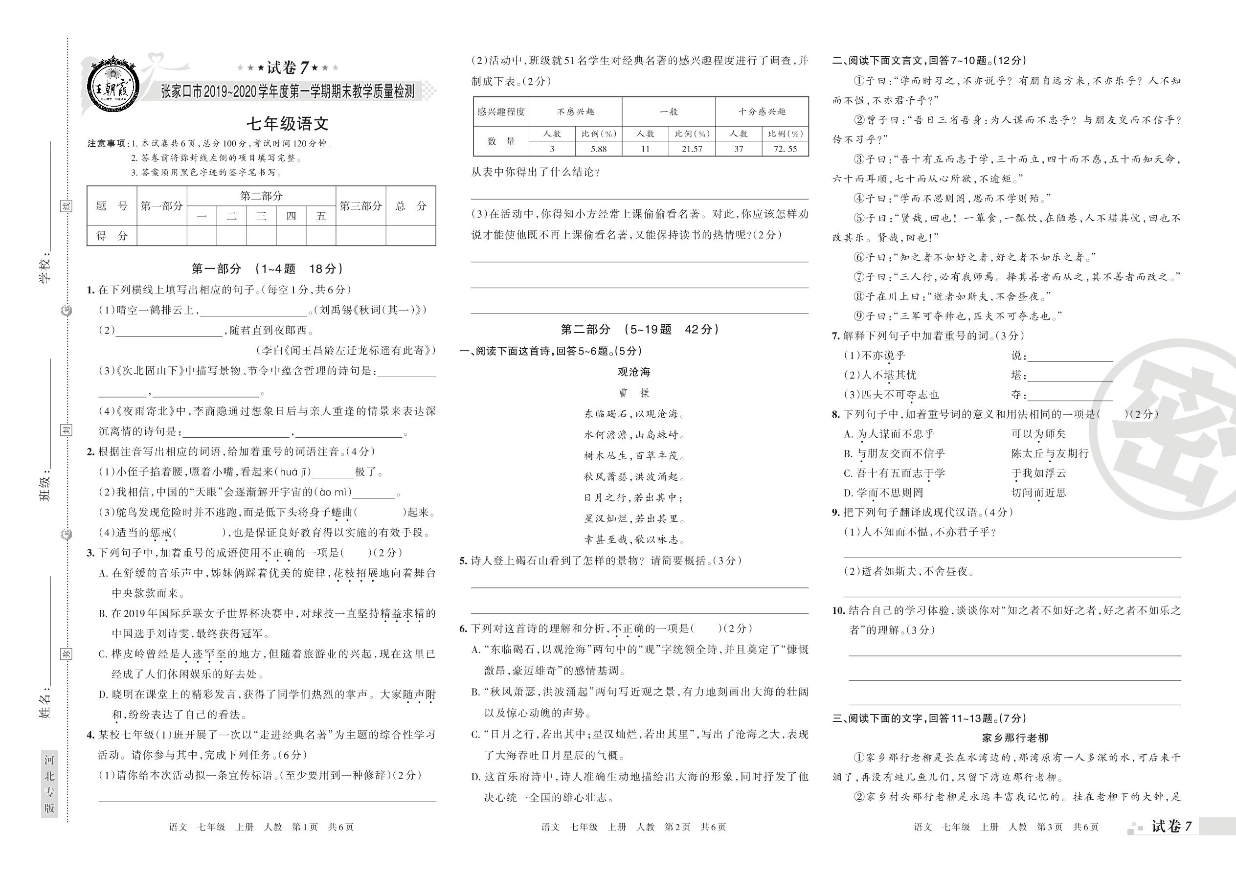 2019-2020学年第一学期张家口市七年级语文试卷(人教版)【7】