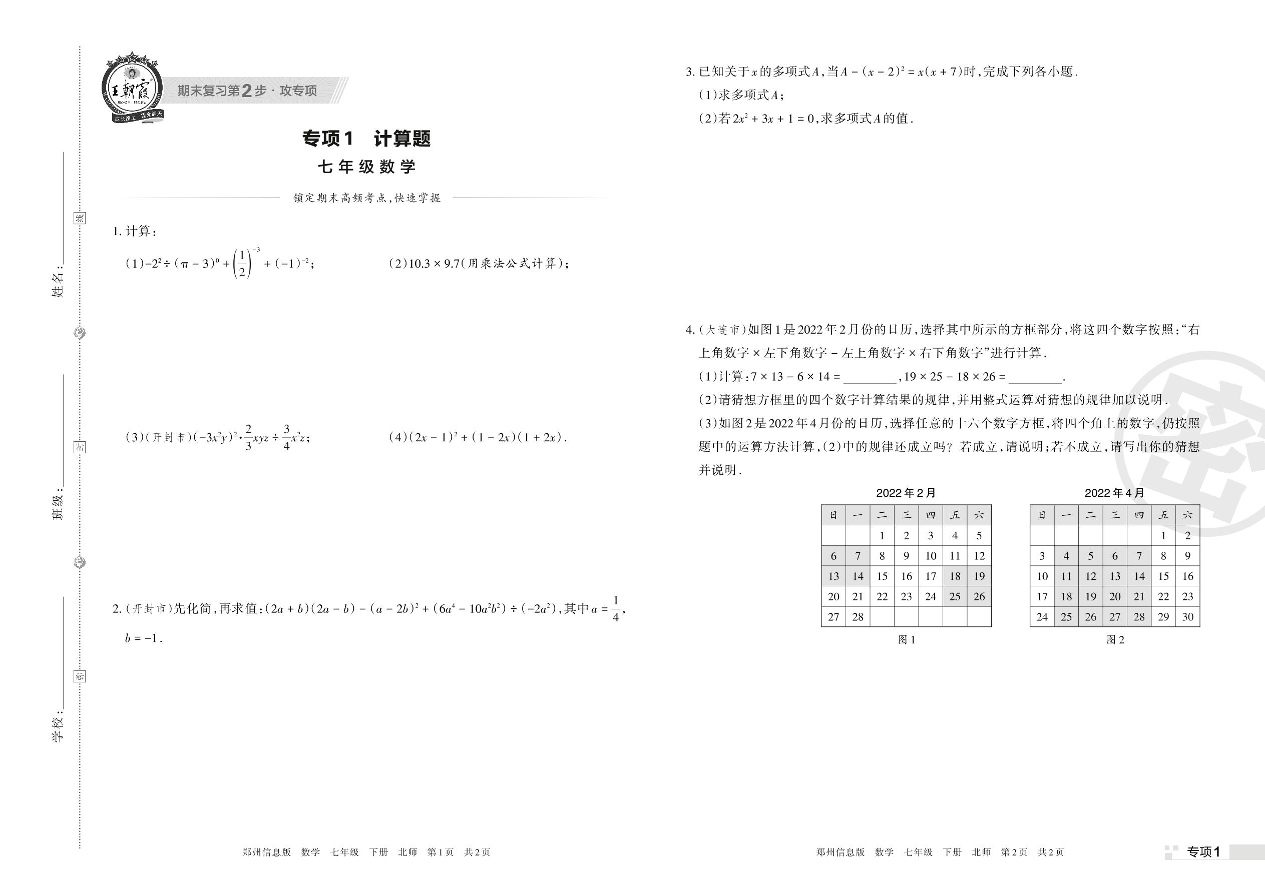 王朝霞期末专项卷——计算题七年级下册数学(北师版)_R220322110347790【1】