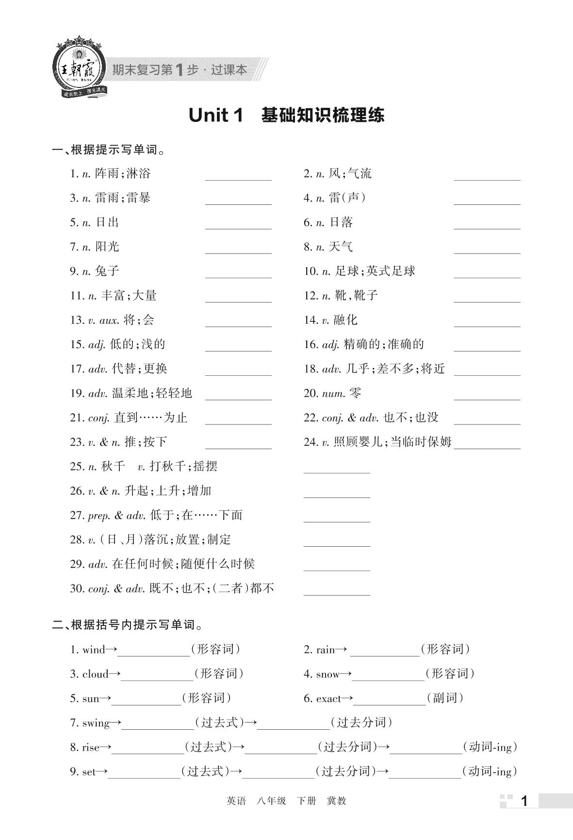 王朝霞期末过课本——Unit 1 基础知识梳理练八年级下册英语(冀教版)