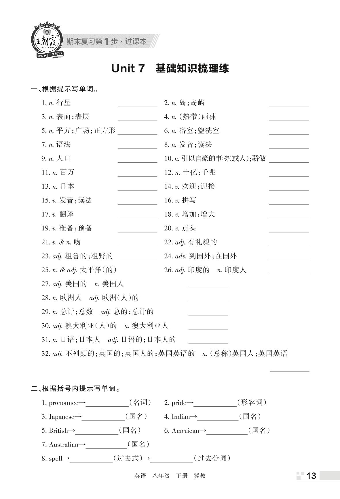 王朝霞期末过课本——Unit 7 基础知识梳理练八年级下册英语(冀教版)