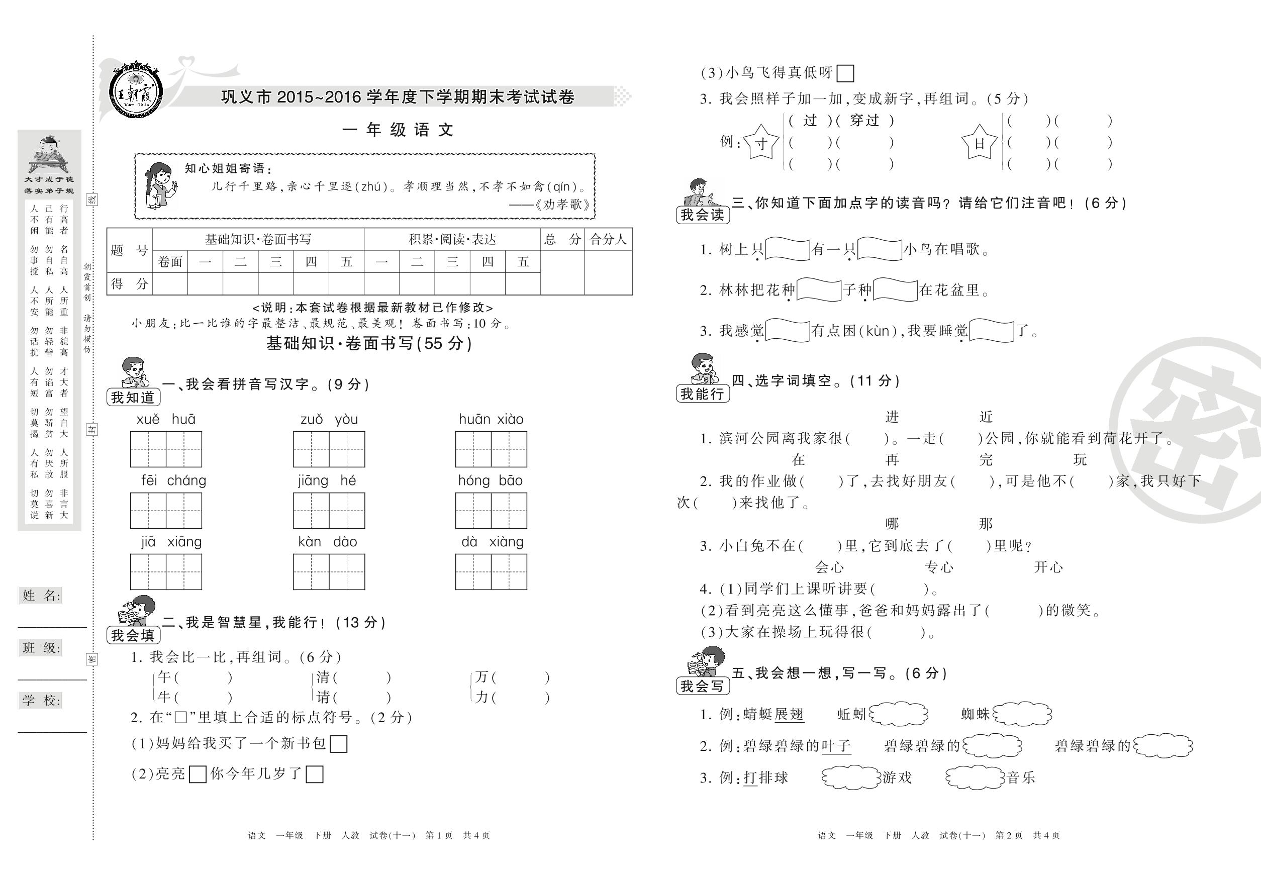 2015-2016学年第二学期巩义市一年级语文试卷(人教版)【11】