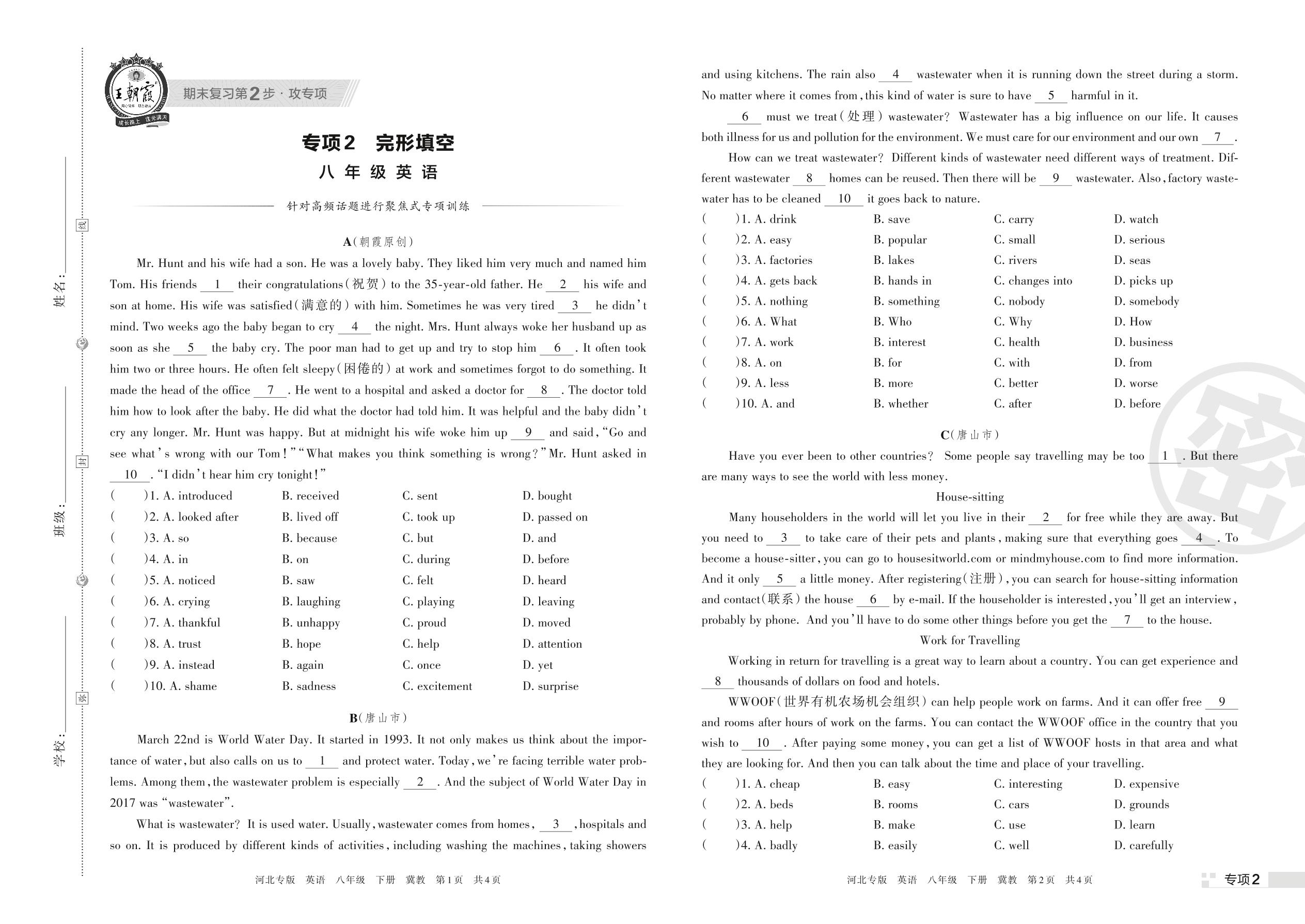 王朝霞期末专项卷——完形填空八年级下册英语(冀教版)【2】