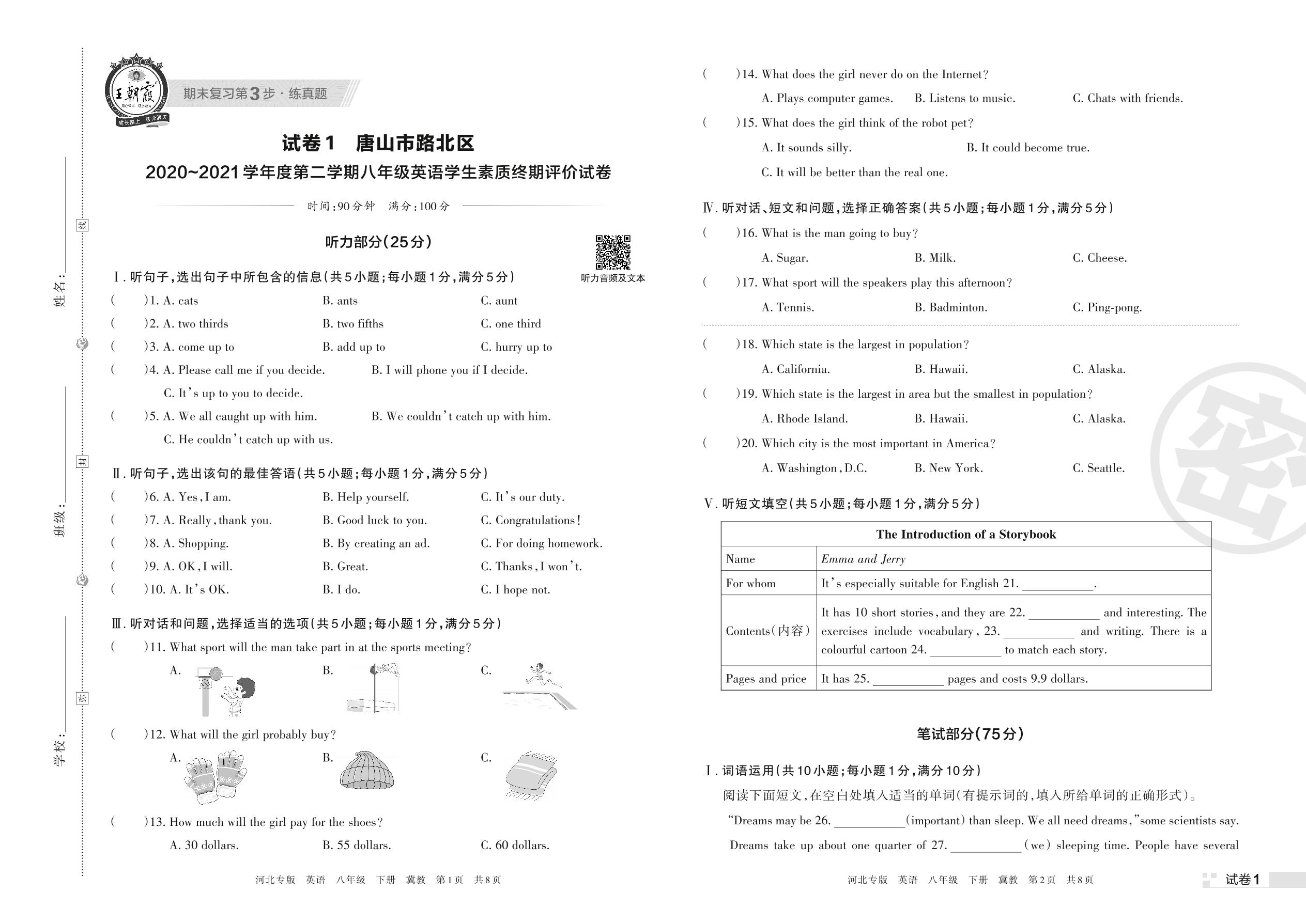 唐山市路北区2020~2021学年度第二学期八年级英语学生素质终期评价试卷(冀教版)【1】