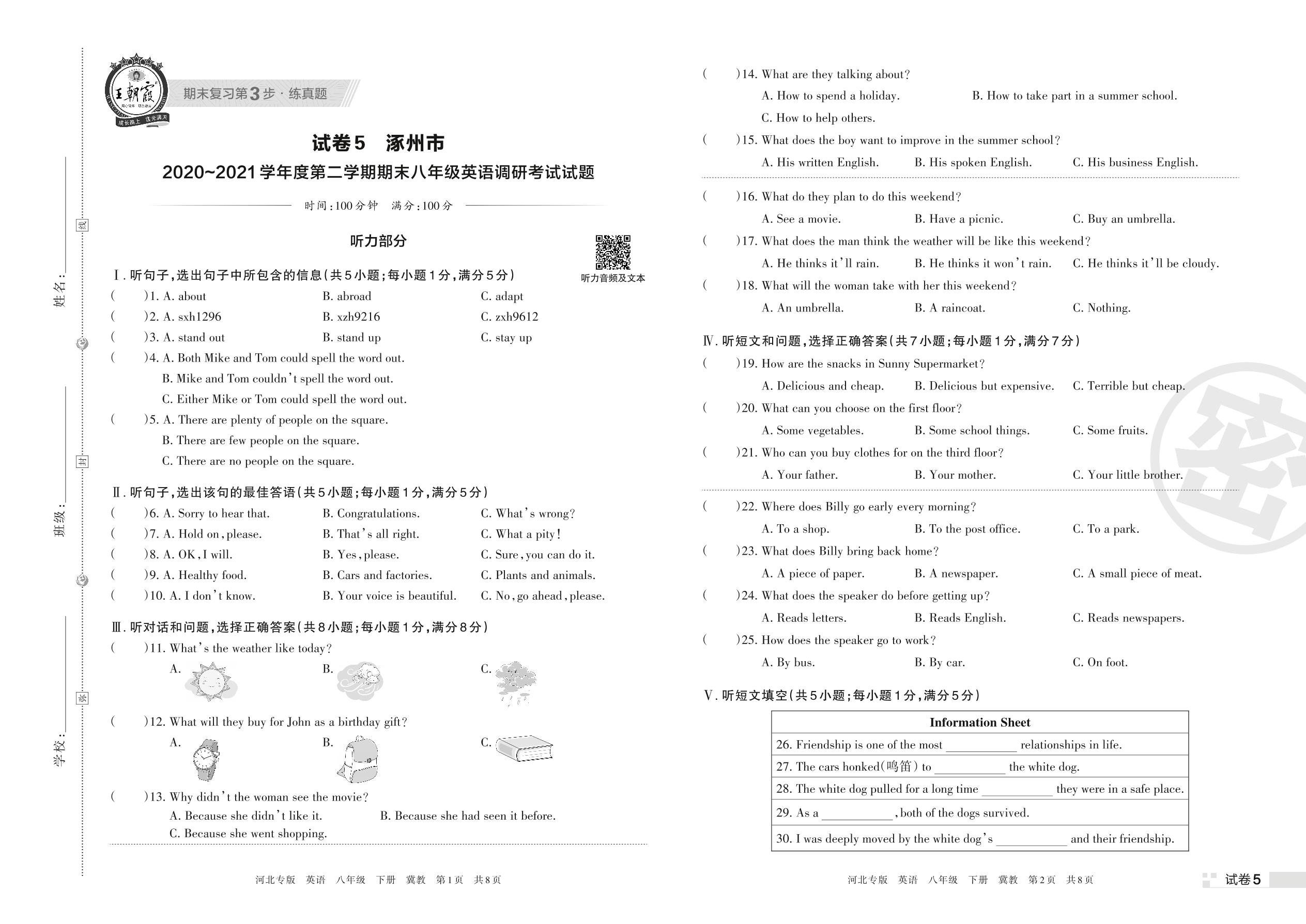涿州市2020~2021学年度第二学期期末八年级英语调研考试试题(冀教版)【5】