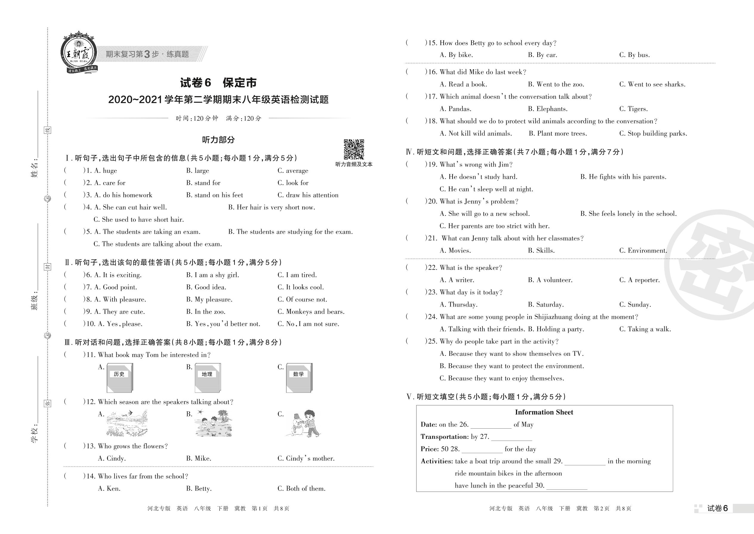 保定市2020~2021学年第二学期期末八年级英语检测试题(冀教版)【6】