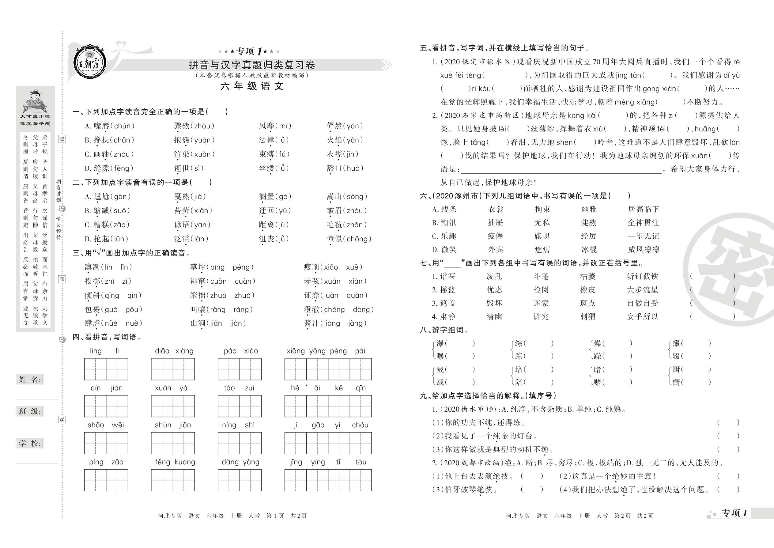 王朝霞期末专项卷——拼音与汉字、词语真题归类复习六年级上册语文(人教版)【0】