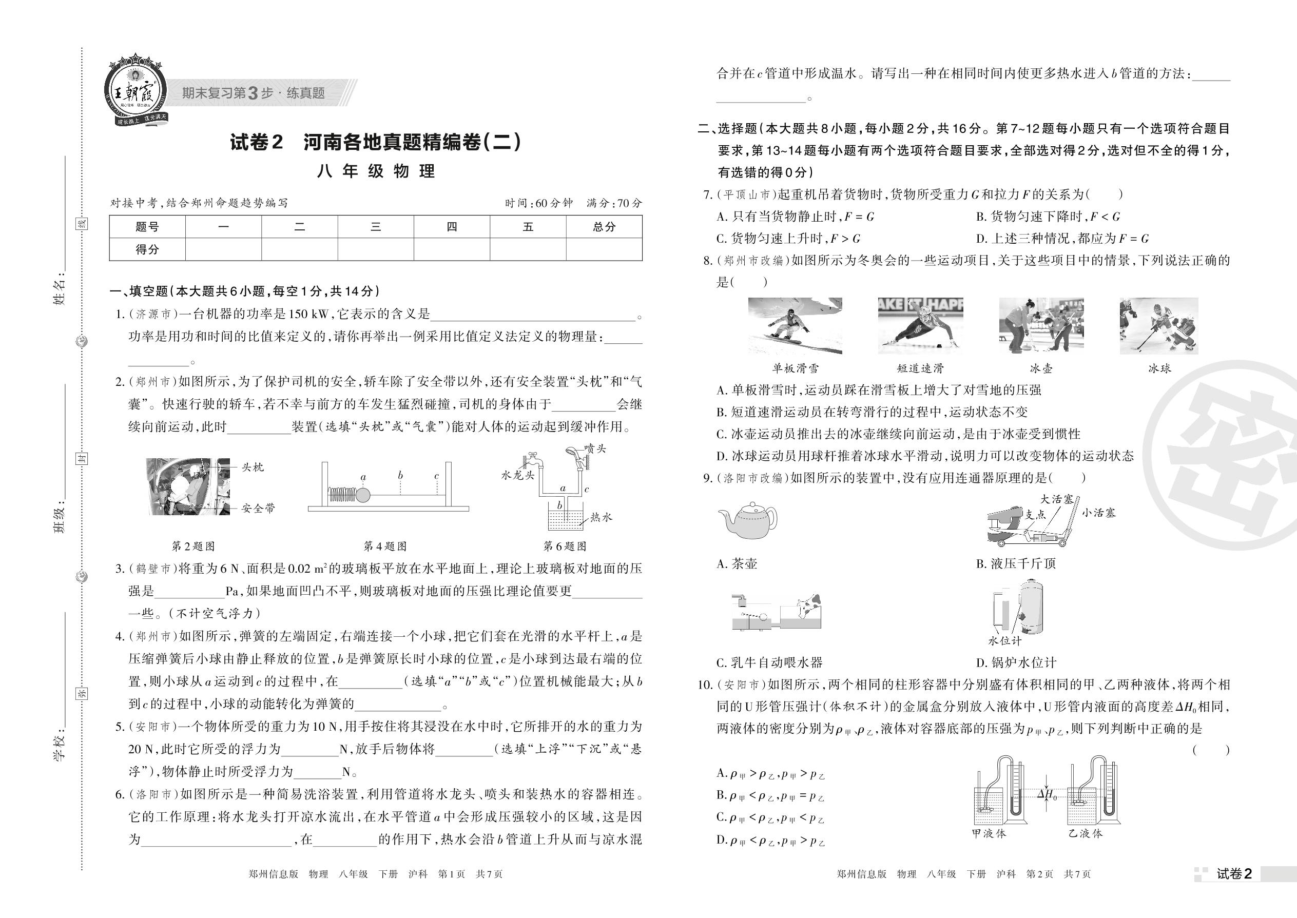 河南各地真题精编卷(二)八年级下册物理(沪科版)【2】
