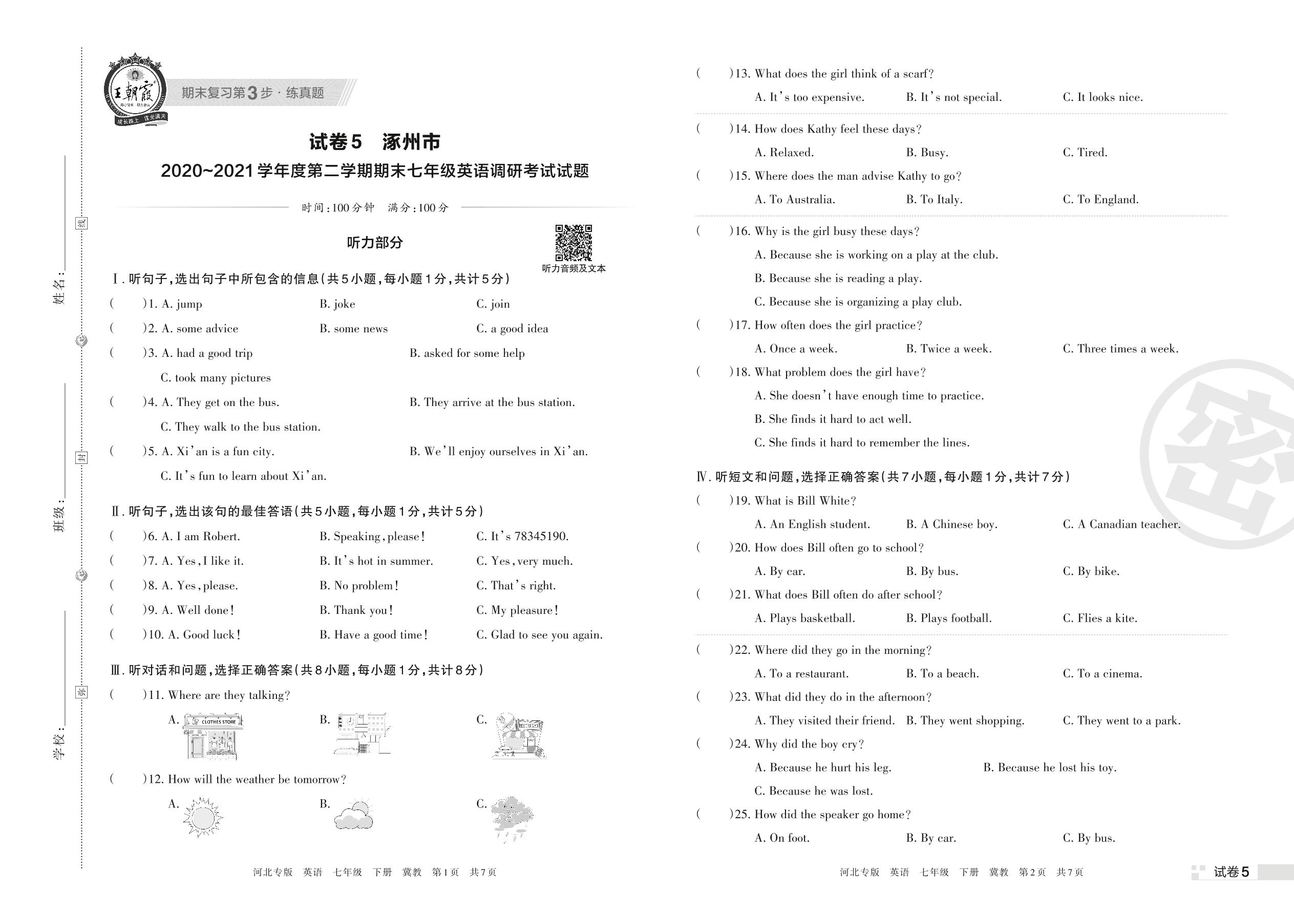 涿州市2020~2021学年度第二学期期末七年级英语调研考试试题(冀教版)【5】