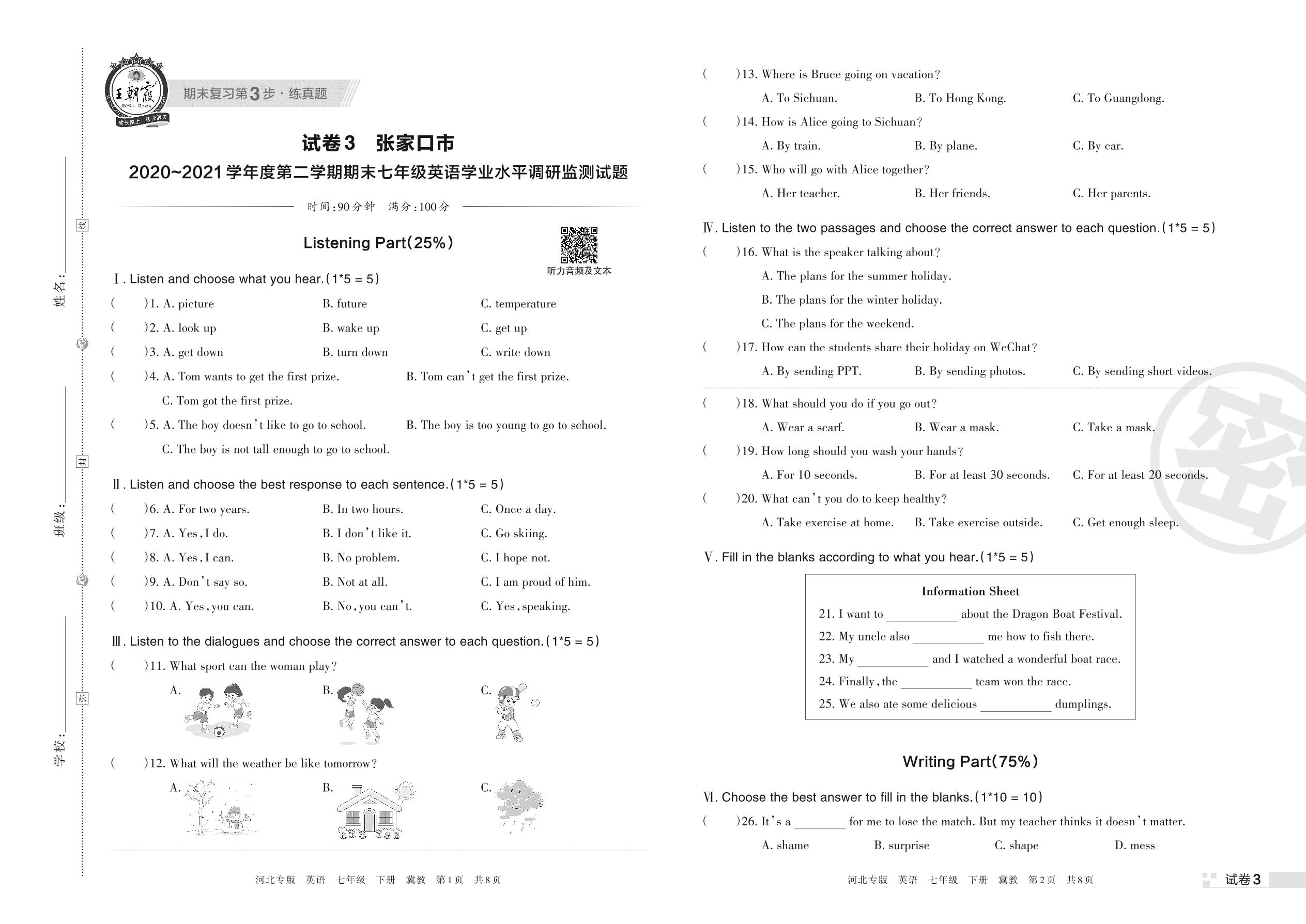 张家口市2020~2021学年度第二学期期末七年级英语学业水平调研监测试题(冀教版)【3】