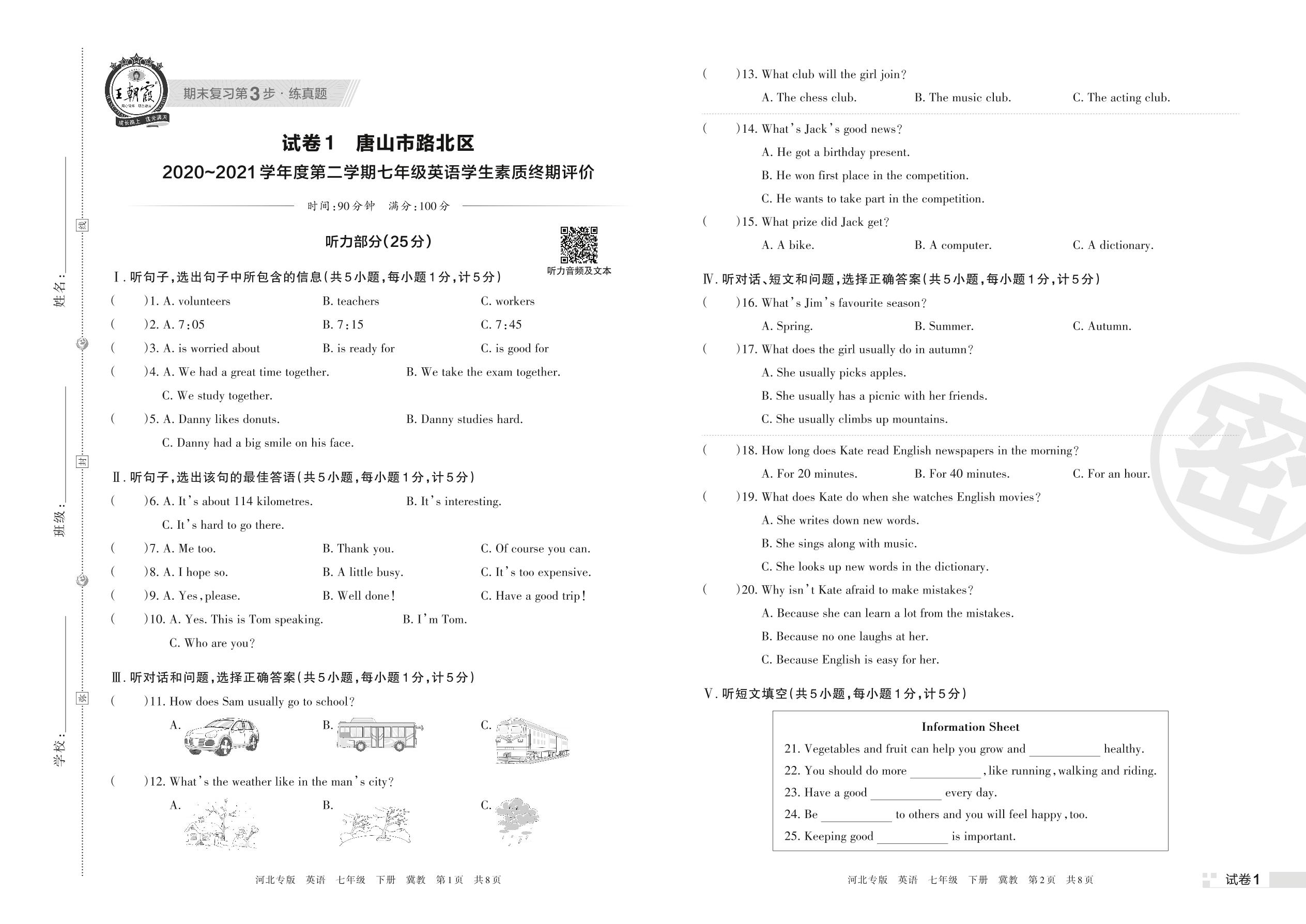 唐山市路北区2020~2021学年度第二学期七年级英语学生素质终期评价(冀教版)【1】