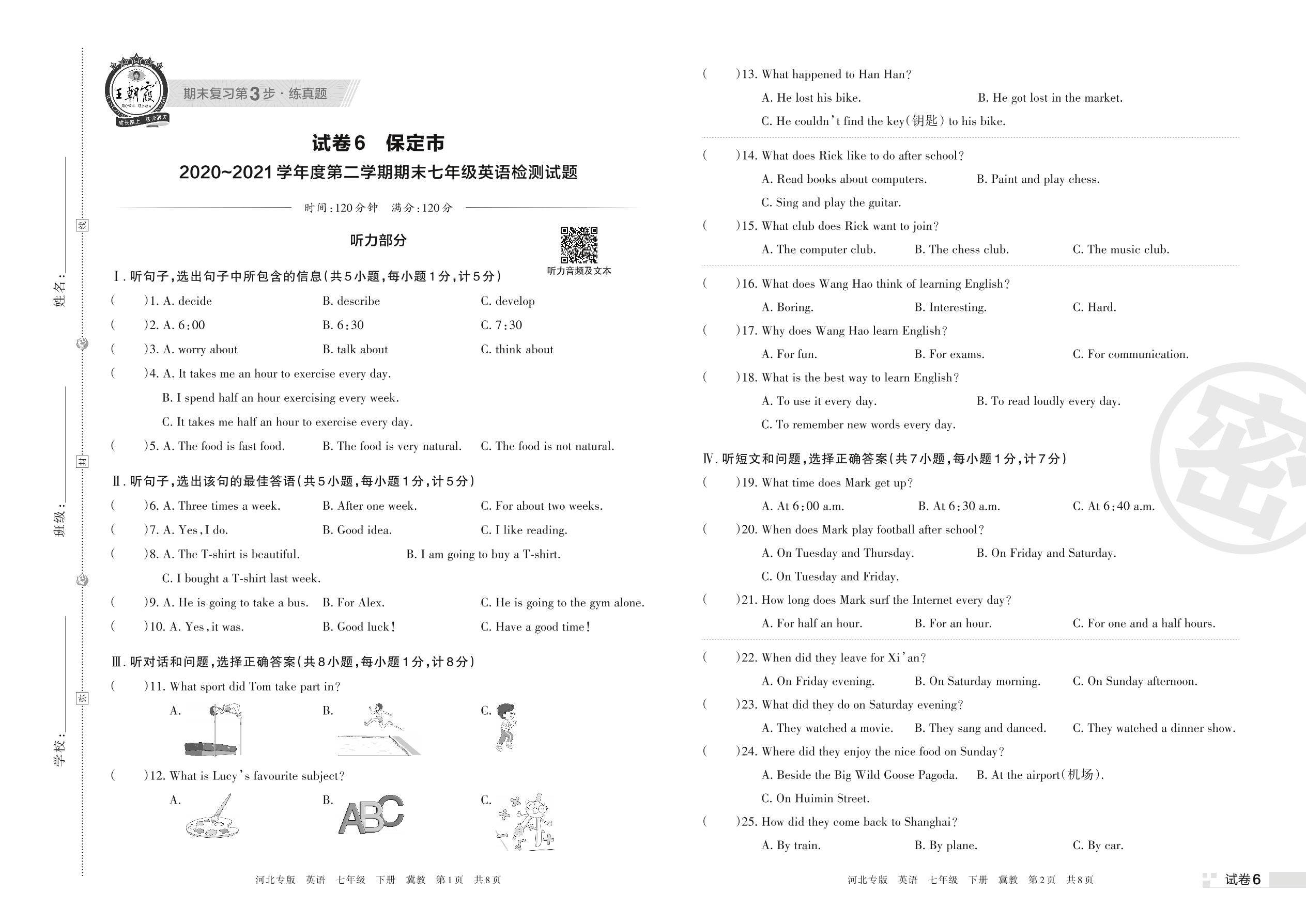 保定市2020~2021学年度第二学期期末七年级英语检测试题(冀教版)【6】