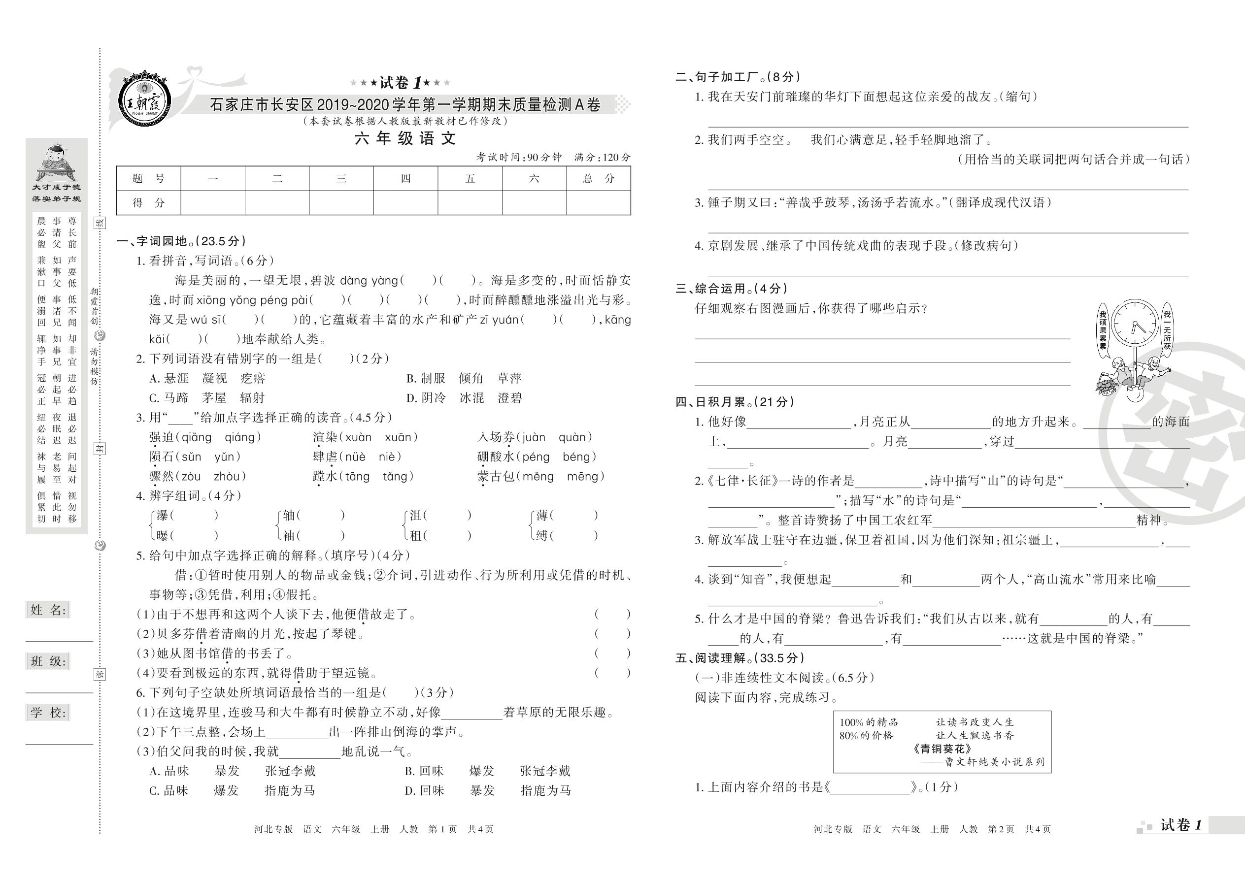 2019-2020学年第一学期石家庄市长安区六年级语文试卷(人教版)【1】