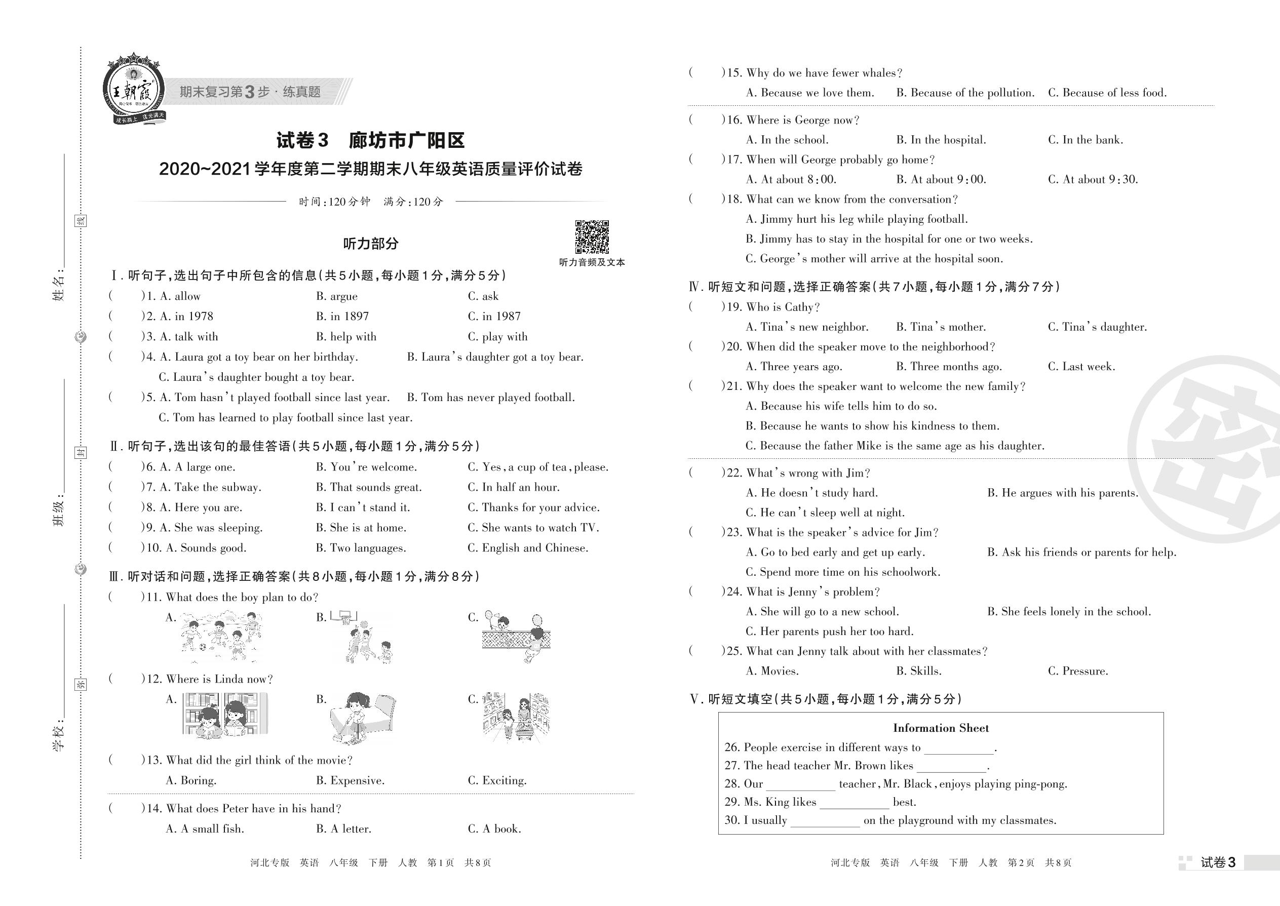 廊坊市广阳区2020~2021学年度第二学期期末八年级英语质量评价试卷(人教版)【3】