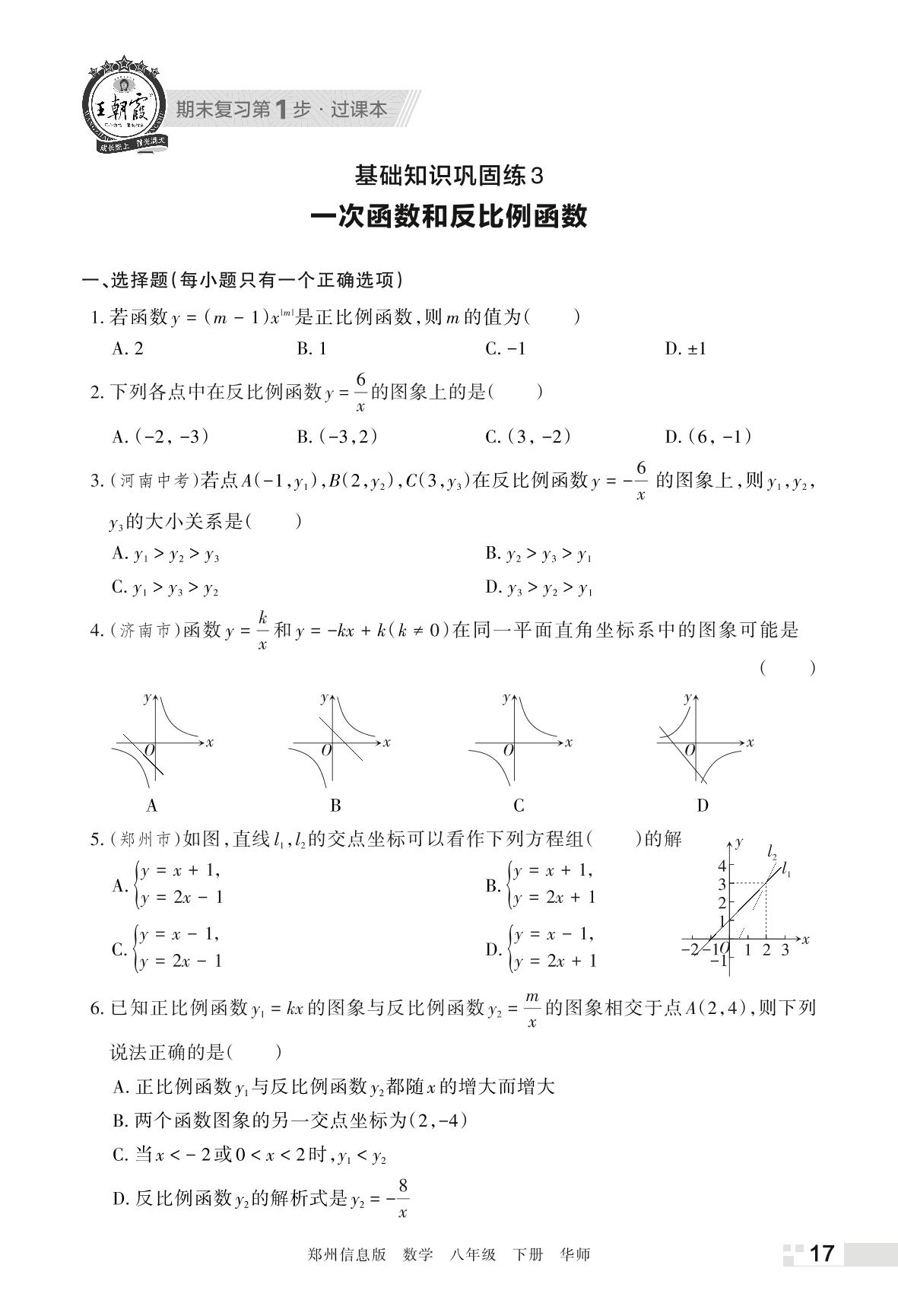 王朝霞期末过课本——基础知识巩固练3 一次函数和反比例函数八年级下册数学(华师版)