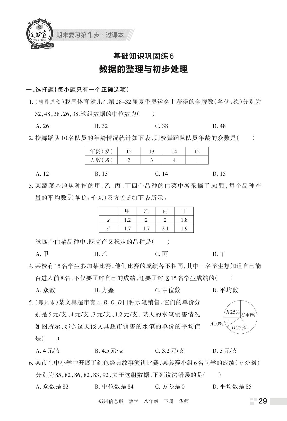 王朝霞期末过课本——基础知识巩固练6 数据的整理与初步处理八年级下册数学(华师版)