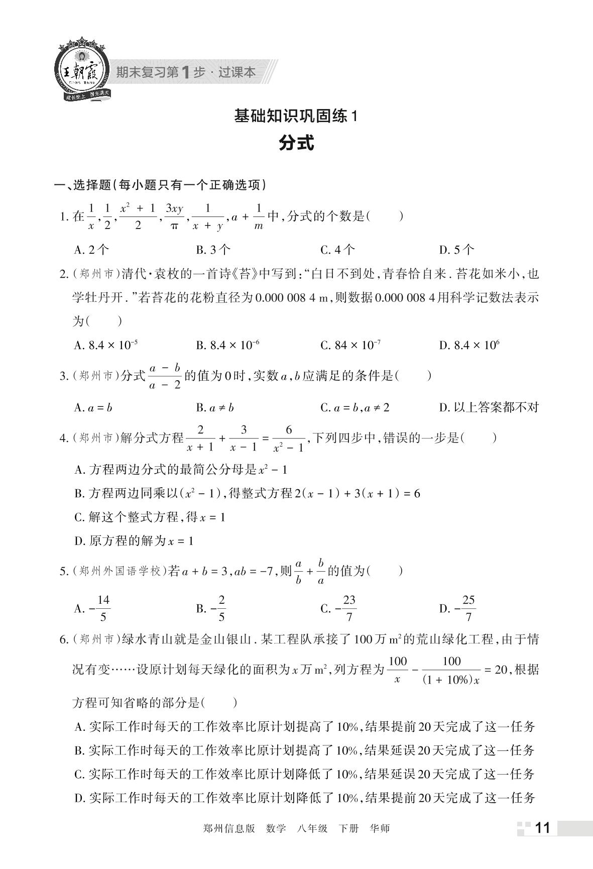 王朝霞期末过课本——基础知识巩固练1 分式八年级下册数学(华师版)