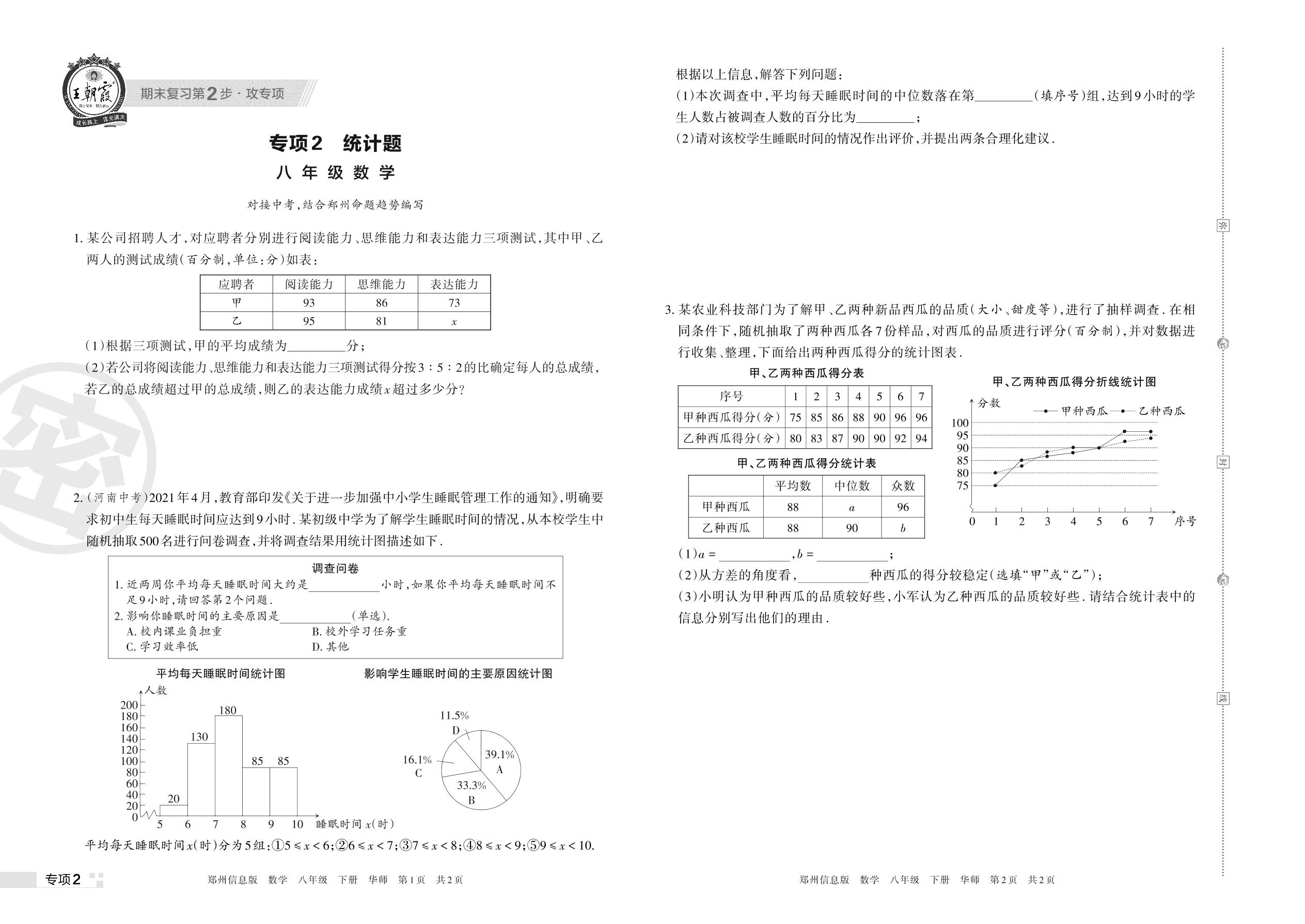 王朝霞期末专项卷——统计题八年级下册数学(华师版)【2】